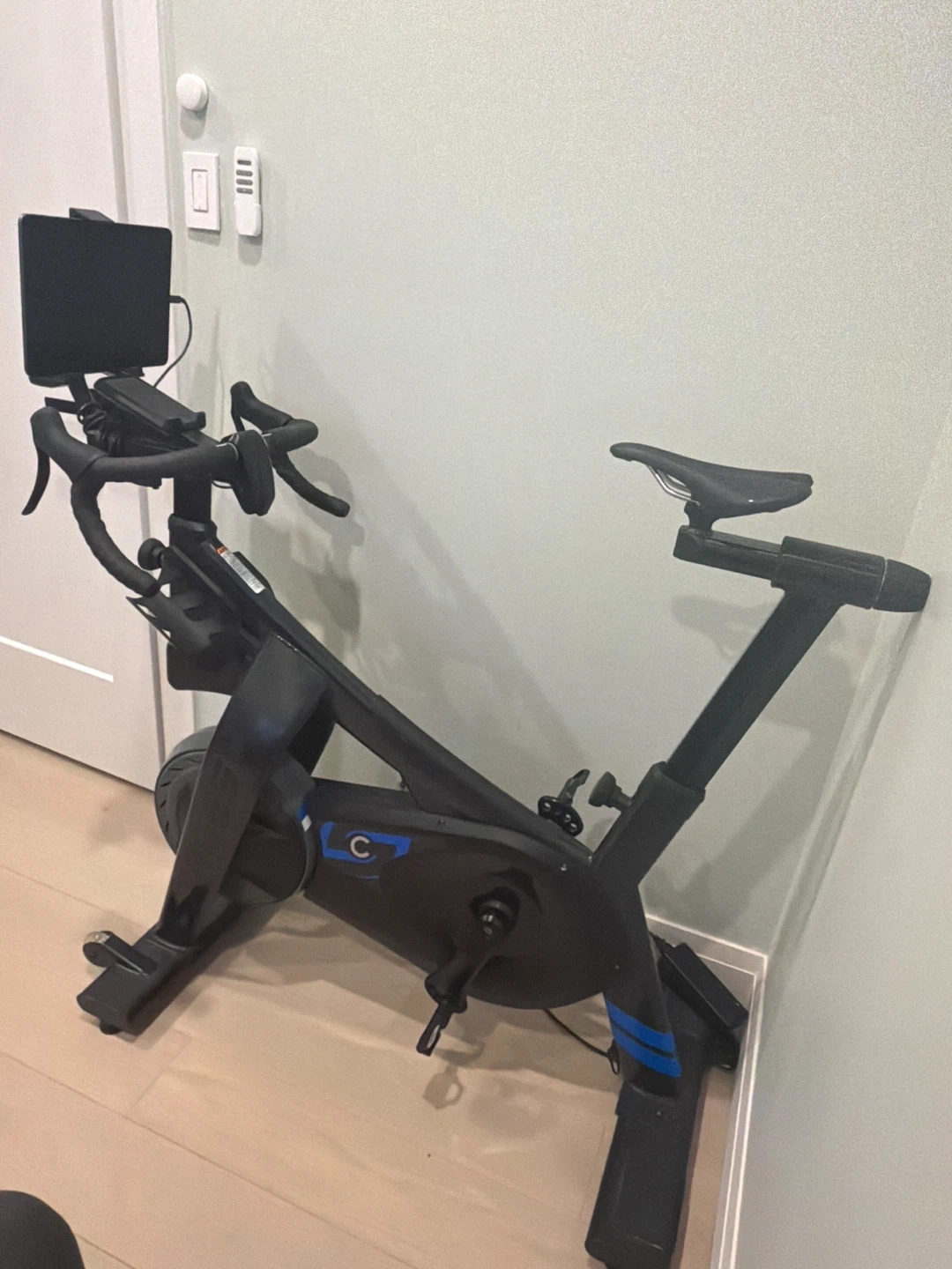 This is a Stages SC1 indoor cycling bike. It features adjustable seat and handlebars for a comfortable ride. The bike is black with blue accents and includes a tablet holder. Perfect for home workouts!