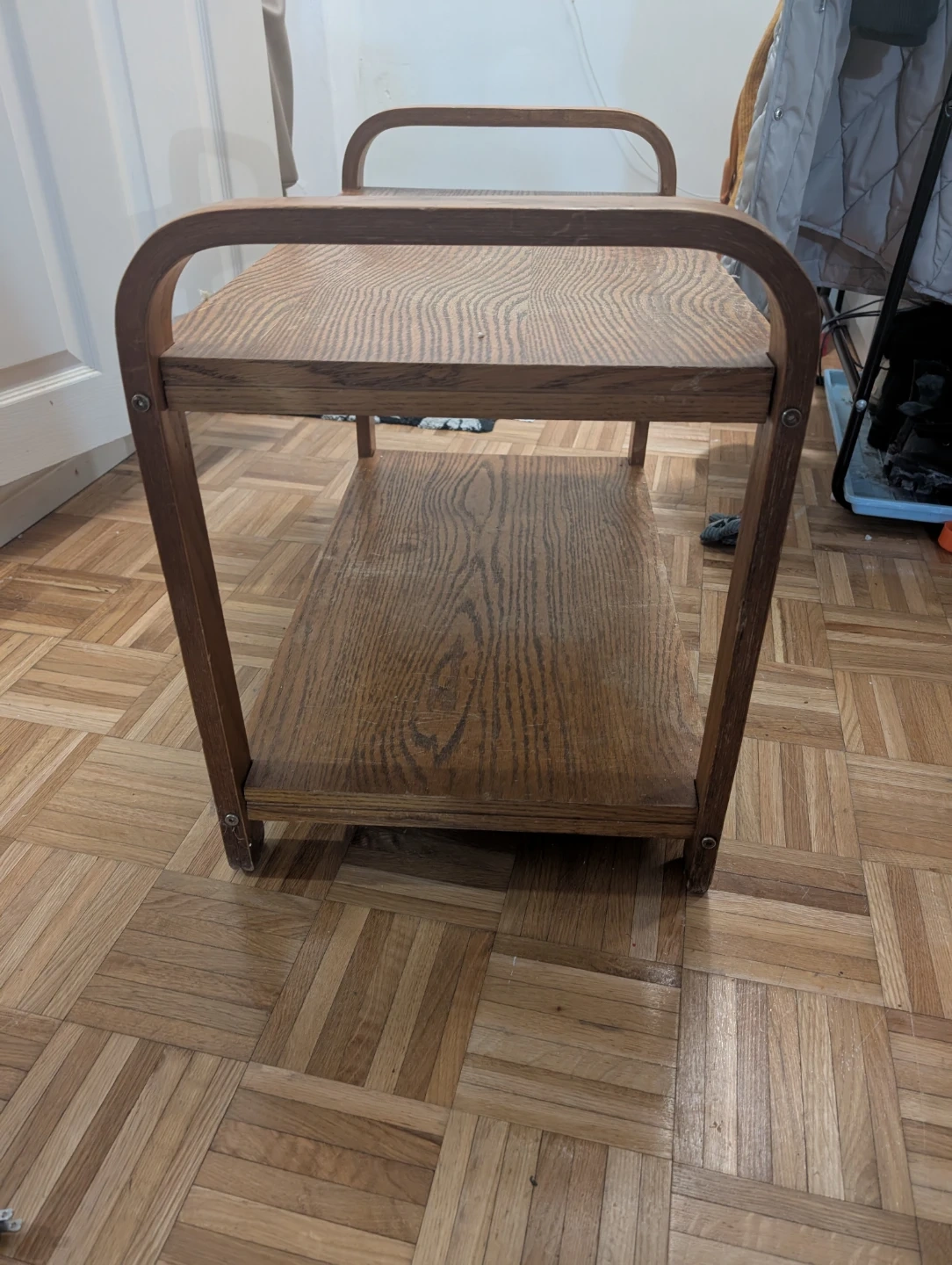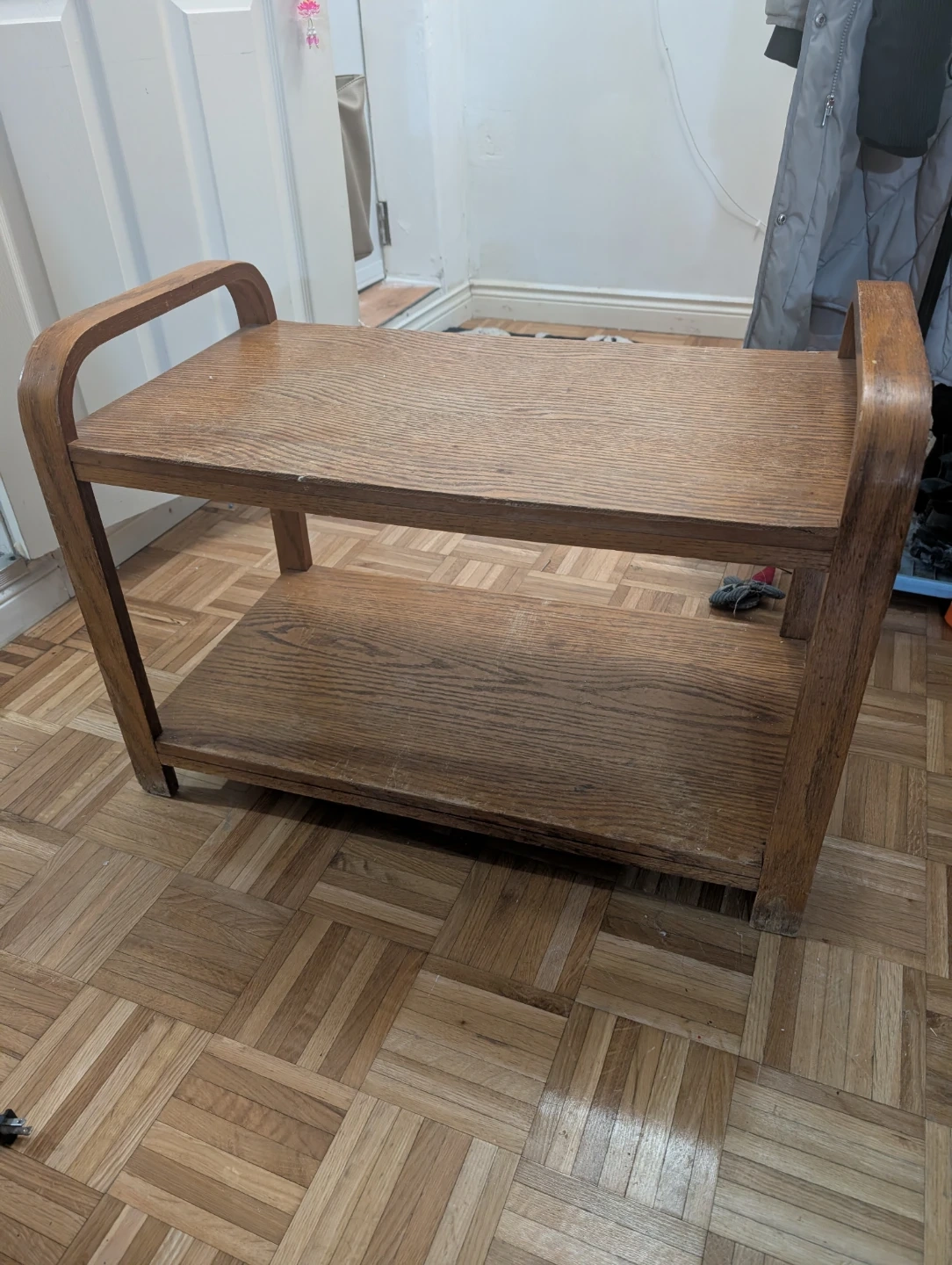 This is a two-tiered wooden shelf unit. It features a top shelf and a lower shelf. The wooden construction offers a rustic look.