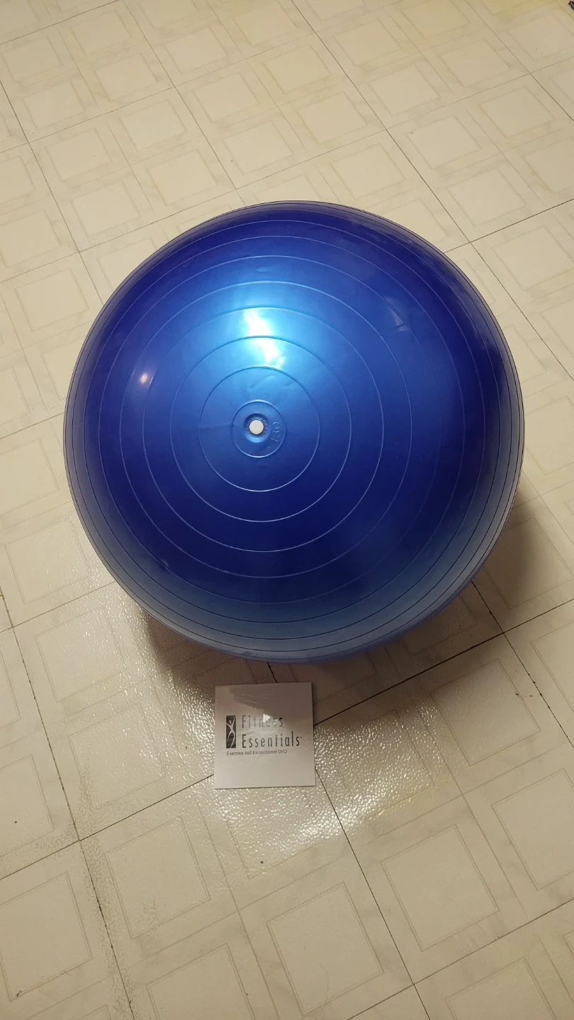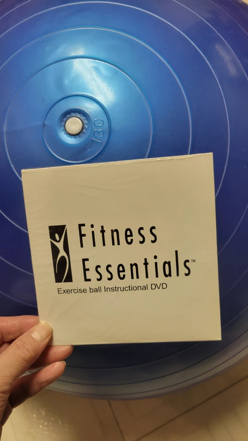 This is a blue Fitness Essentials exercise ball. It comes with an instructional DVD. The ball is made from durable material for your workouts.