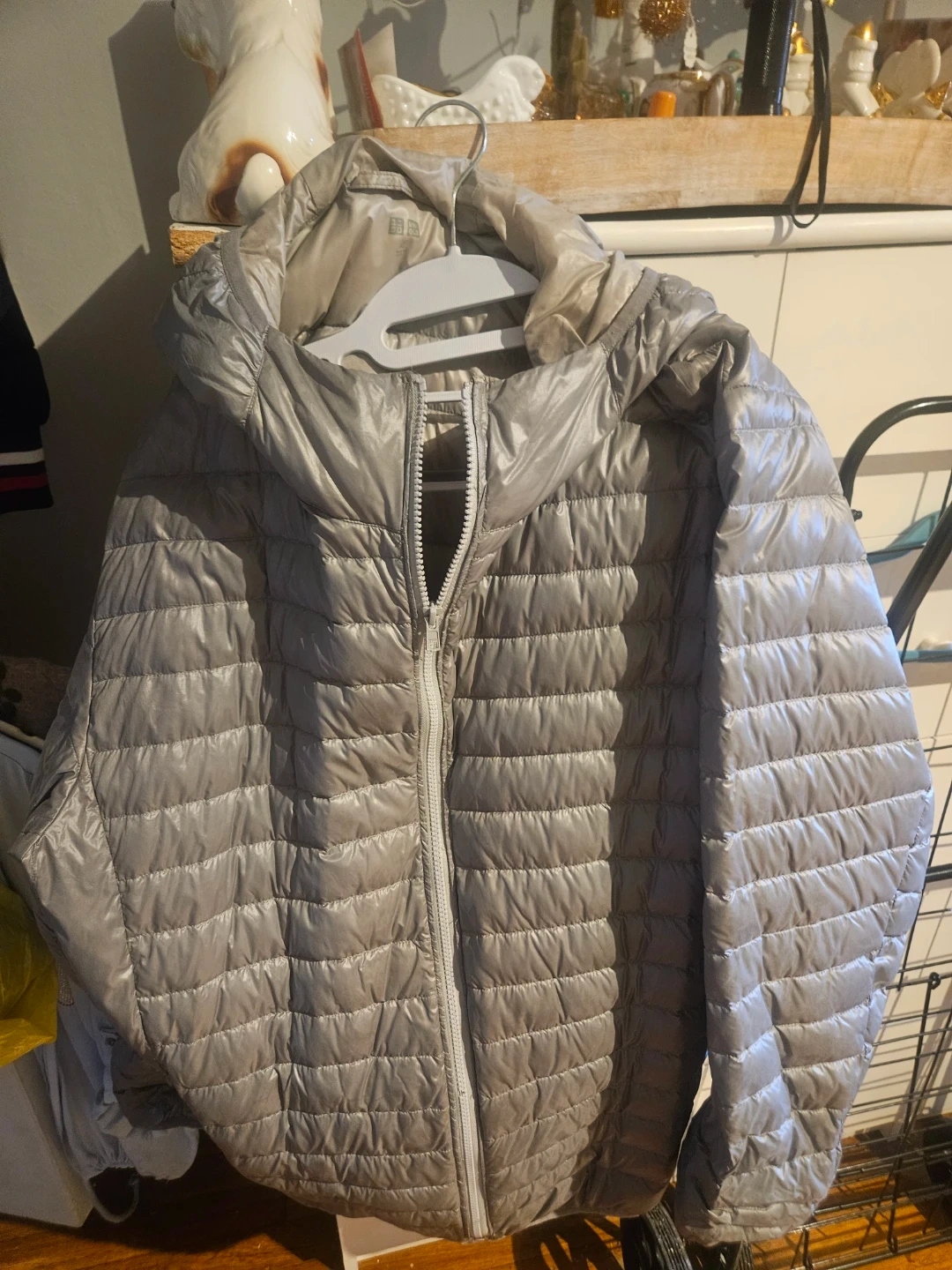 This is a UNIQLO down puffer jacket in size XL. It's a lightweight, packable puffer with a hood. Outer shell and lining are polyester.