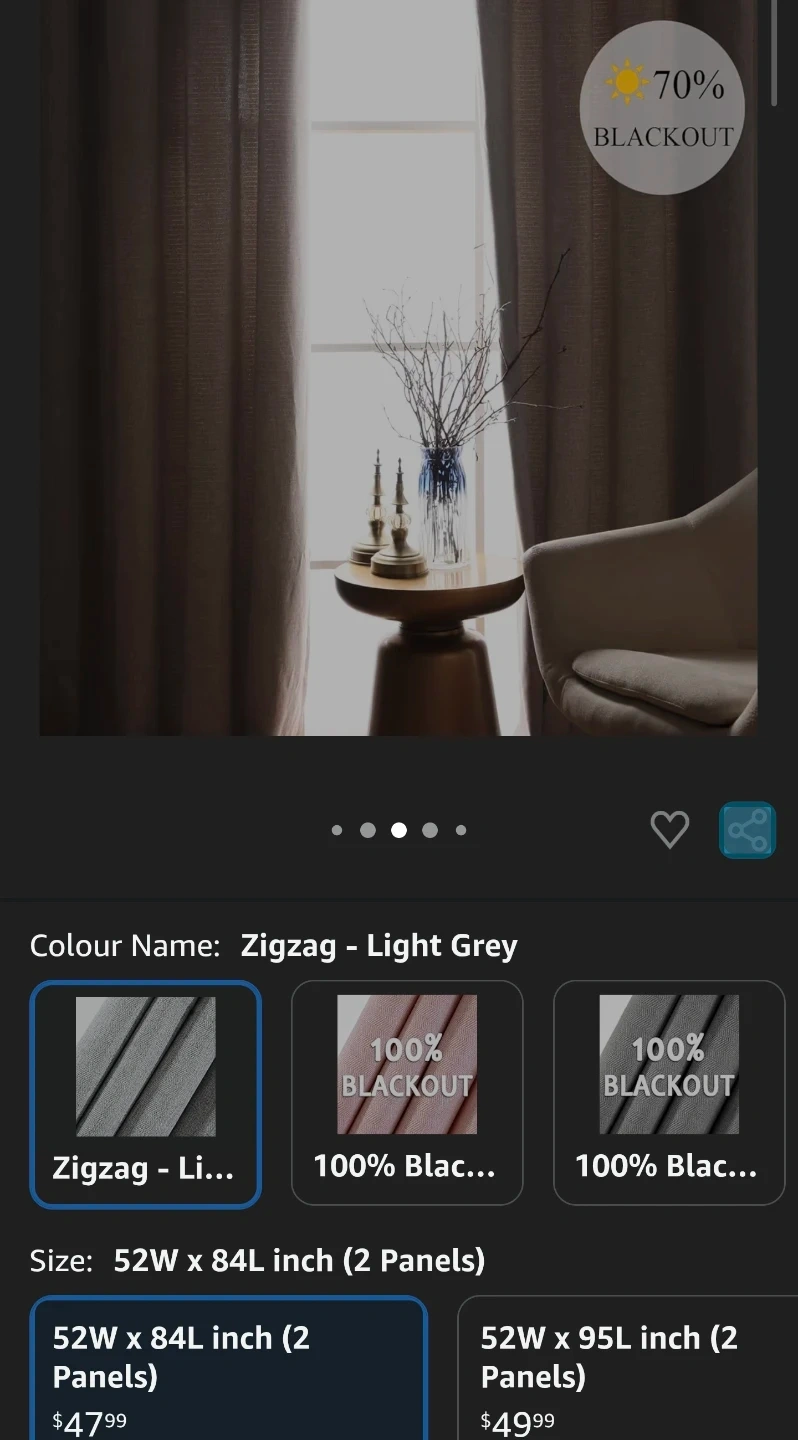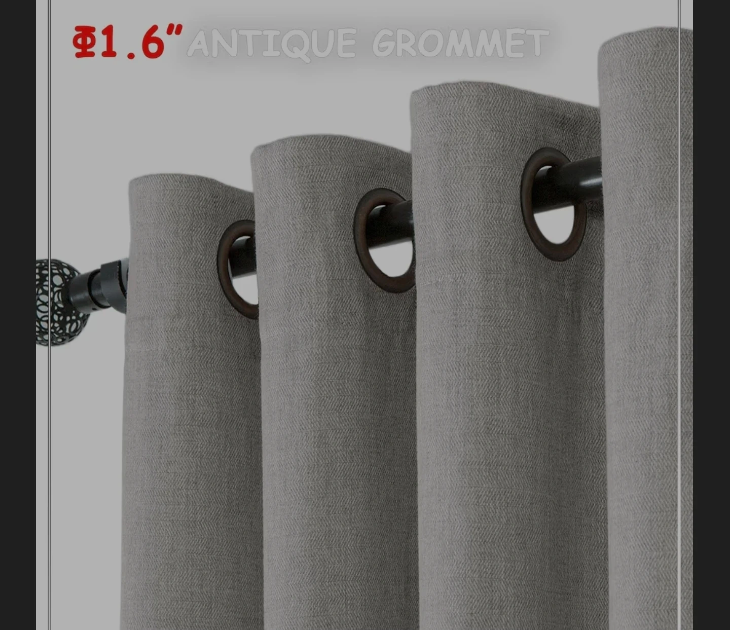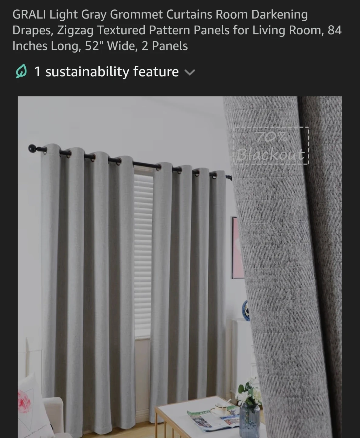 Light grey grommet curtains with a herringbone textured pattern. Each panel is 52" wide and 84" long, providing room darkening and 70% blackout. Includes original packaging.