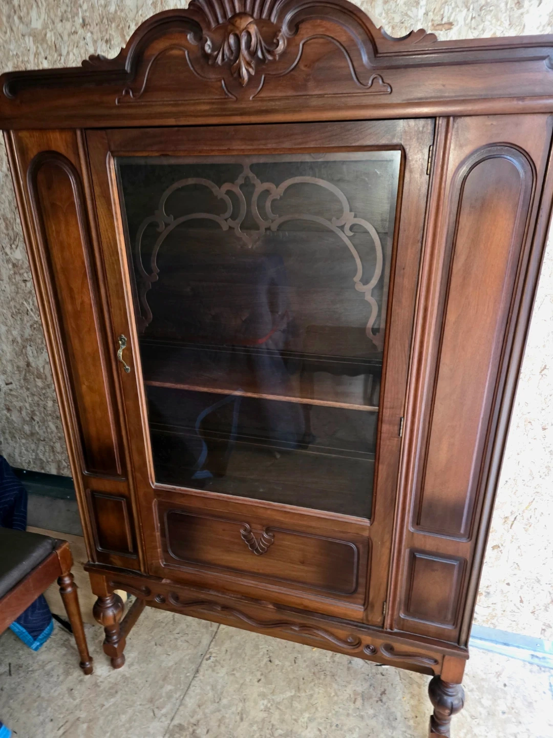 A beautiful wooden display cabinet featuring a decorative carved top and glass door with an ornate design. It has multiple shelves inside for storage. This cabinet would be perfect for showcasing collectibles or fine china. Wood material. In beautiful condition.