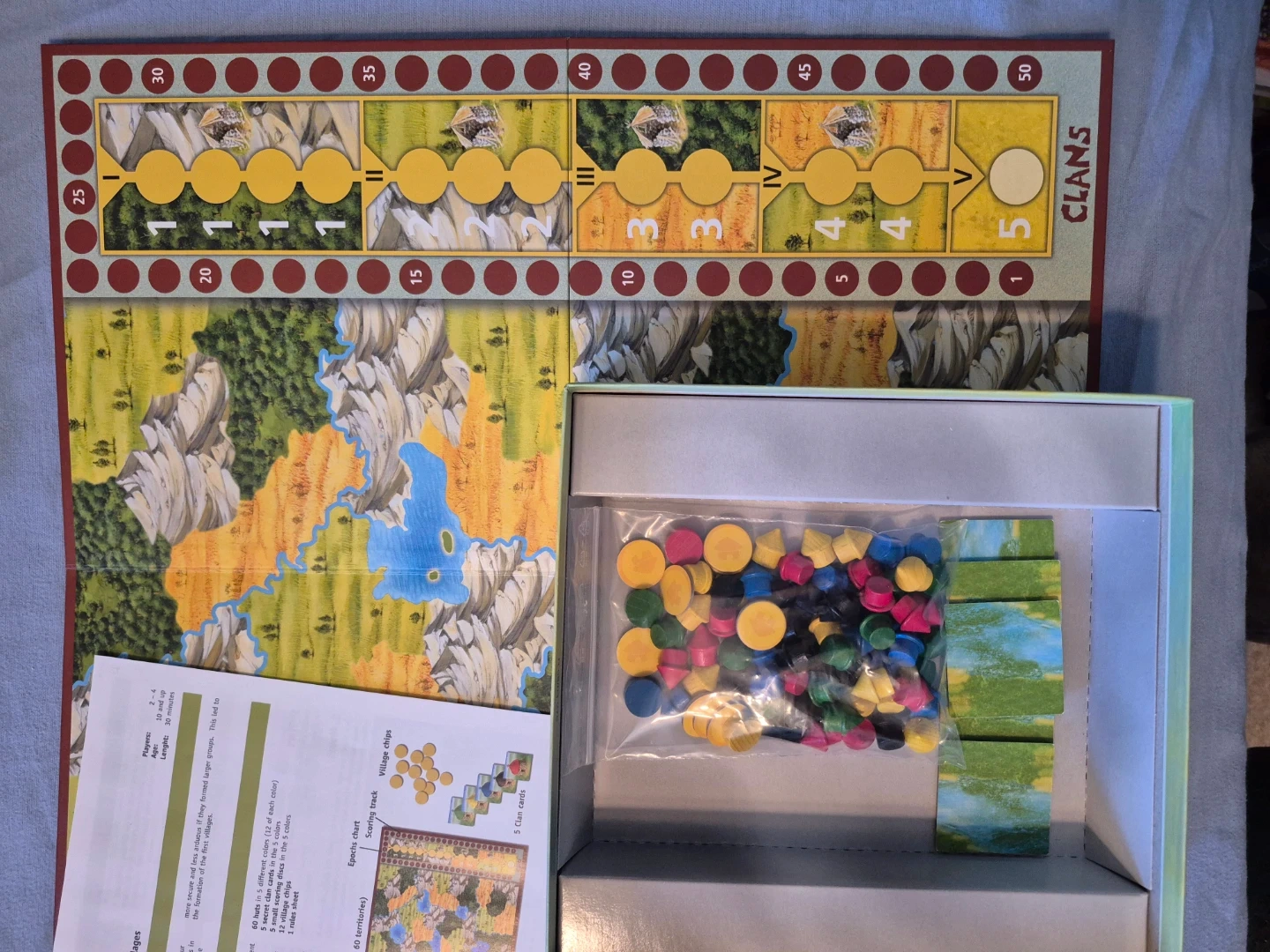This is the Clans board game by Leo Colovini. It includes a game board, village chips, and clan pieces. Designed for 2-4 players.