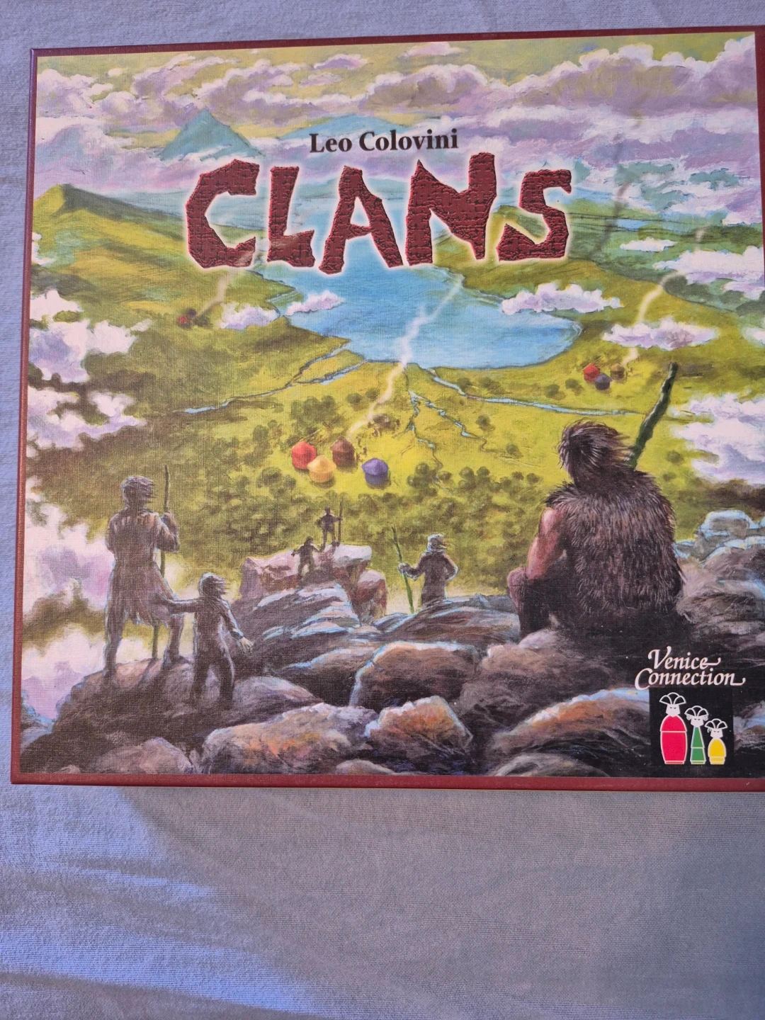 This is the Clans board game by Leo Colovini. It includes a game board, village chips, and clan pieces. Designed for 2-4 players.
