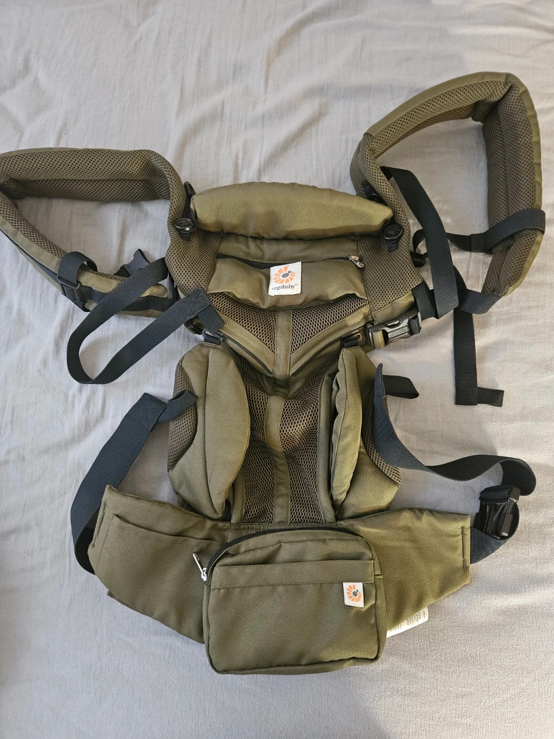 This Ergobaby carrier is in an olive green colour. It's made from durable fabric with mesh panels for breathability. It features padded shoulder straps and a supportive waistband. This carrier is designed for comfortable babywearing.