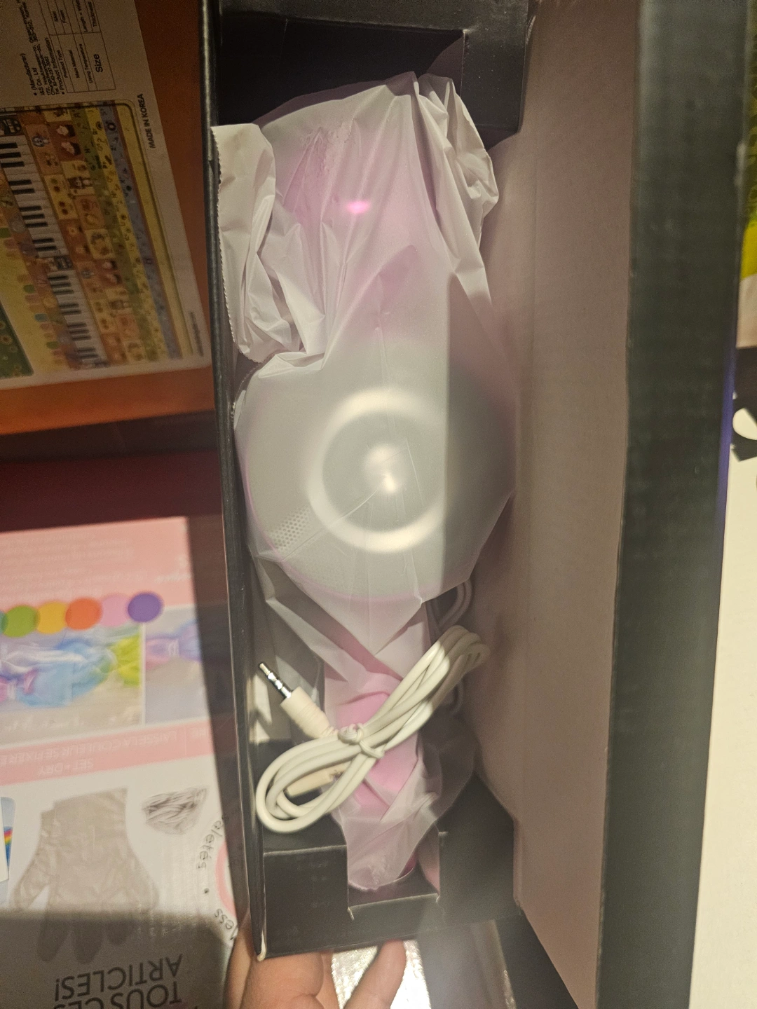 Portable karaoke microphone. Features a built-in speaker and disco light. Includes audio cable. Great for singing and parties.