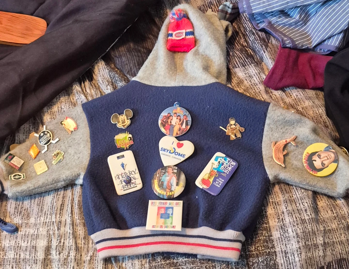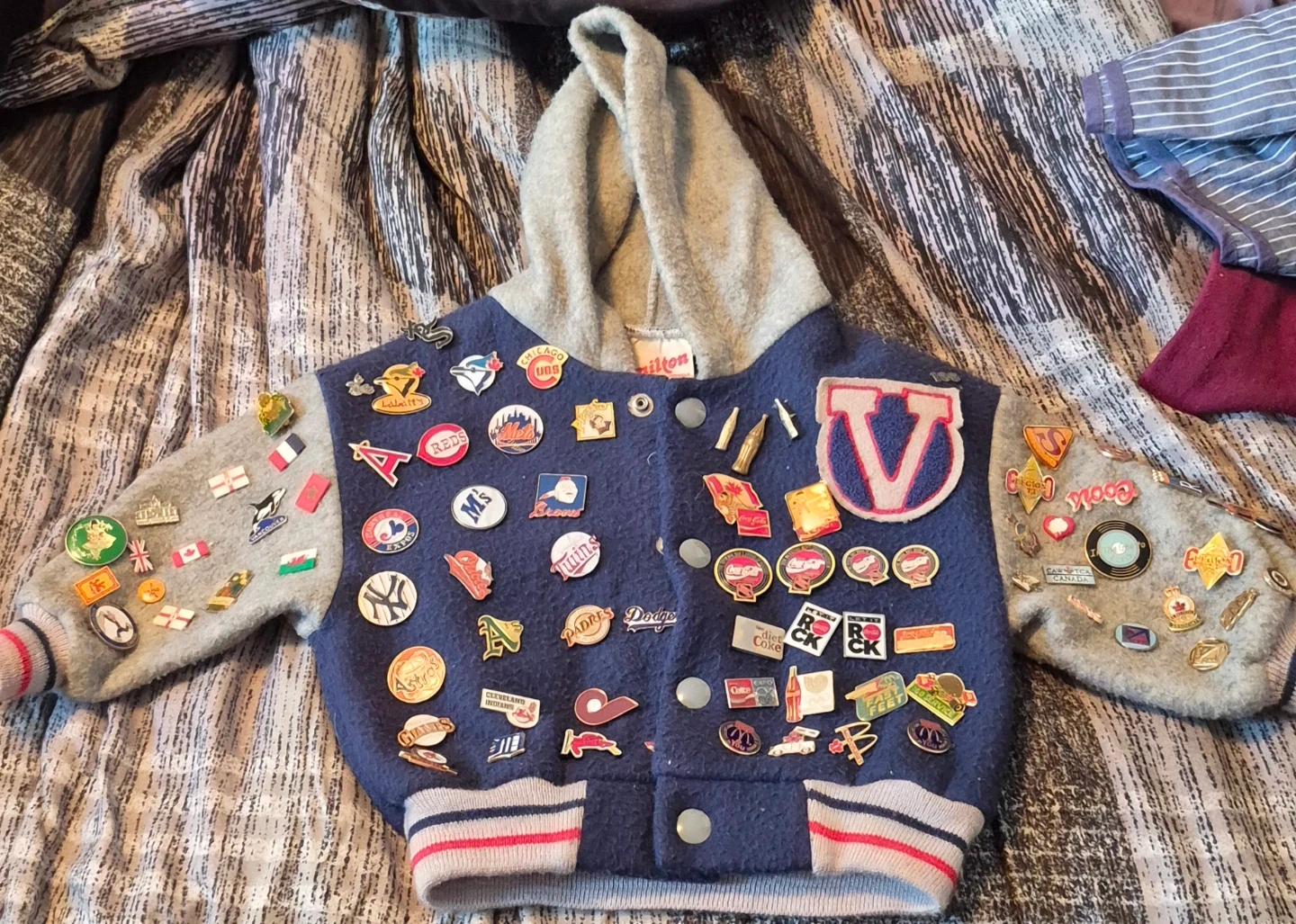 Cool blue and grey varsity jacket covered in an assortment of pins. Features a hood and striped trim. It's a unique piece perfect for collectors or fans of vintage styles!