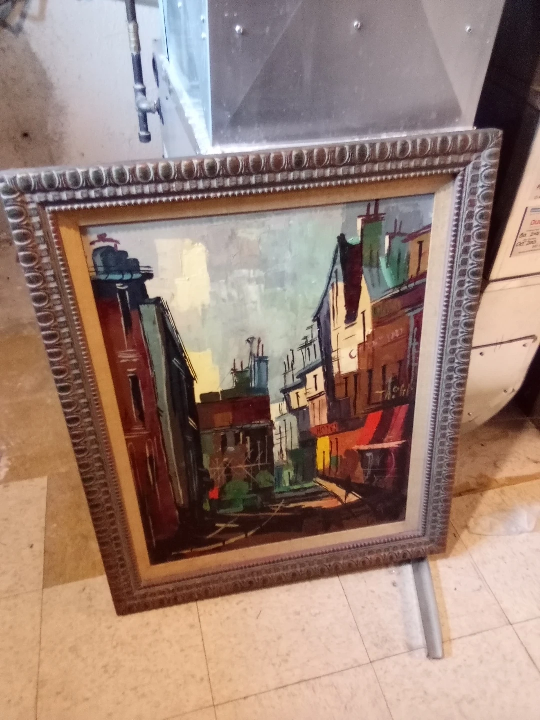 This is an oil painting of a city street scene. It's framed in a decorative, vintage-style border. This piece would add character to any room's decor.