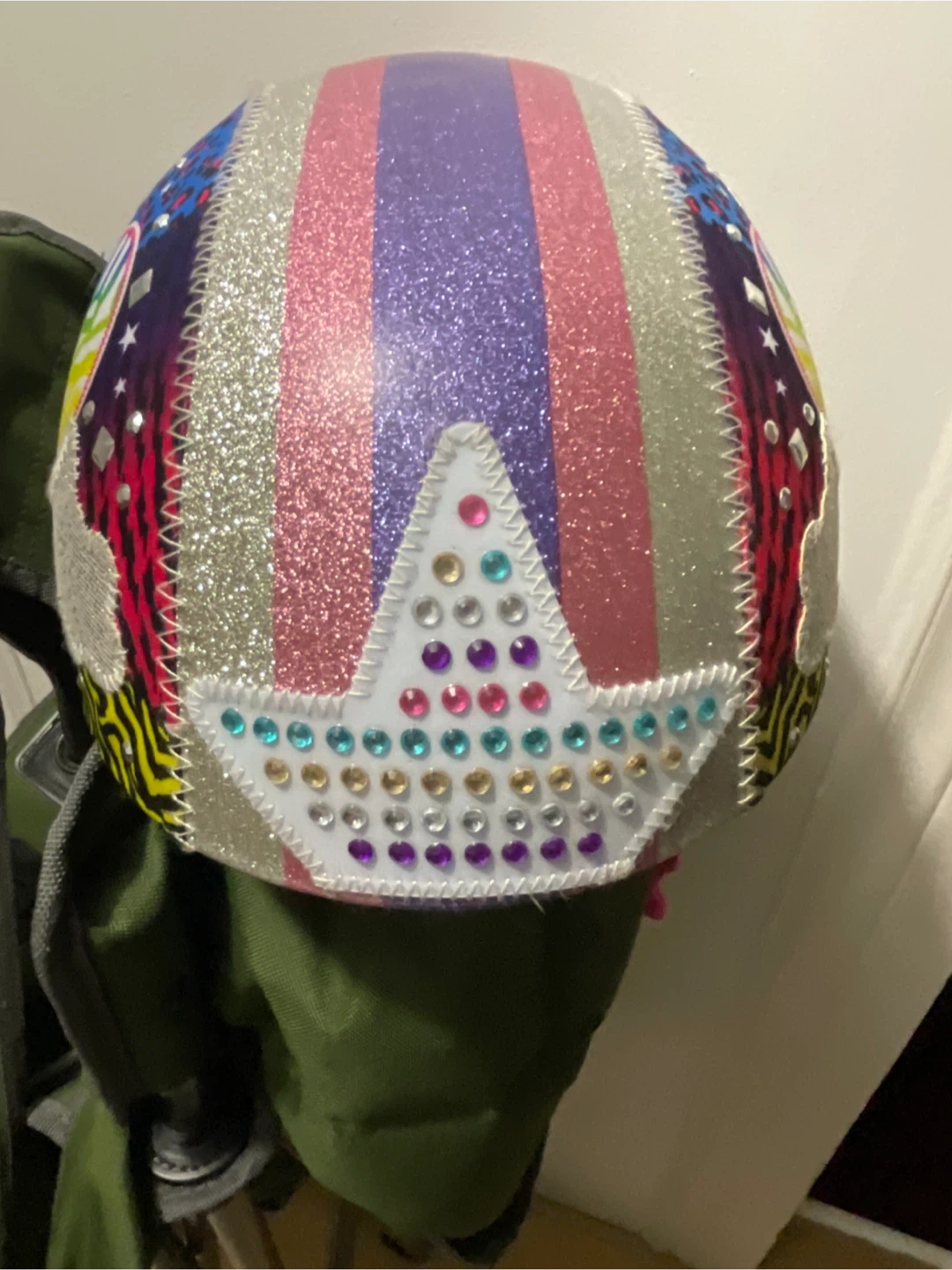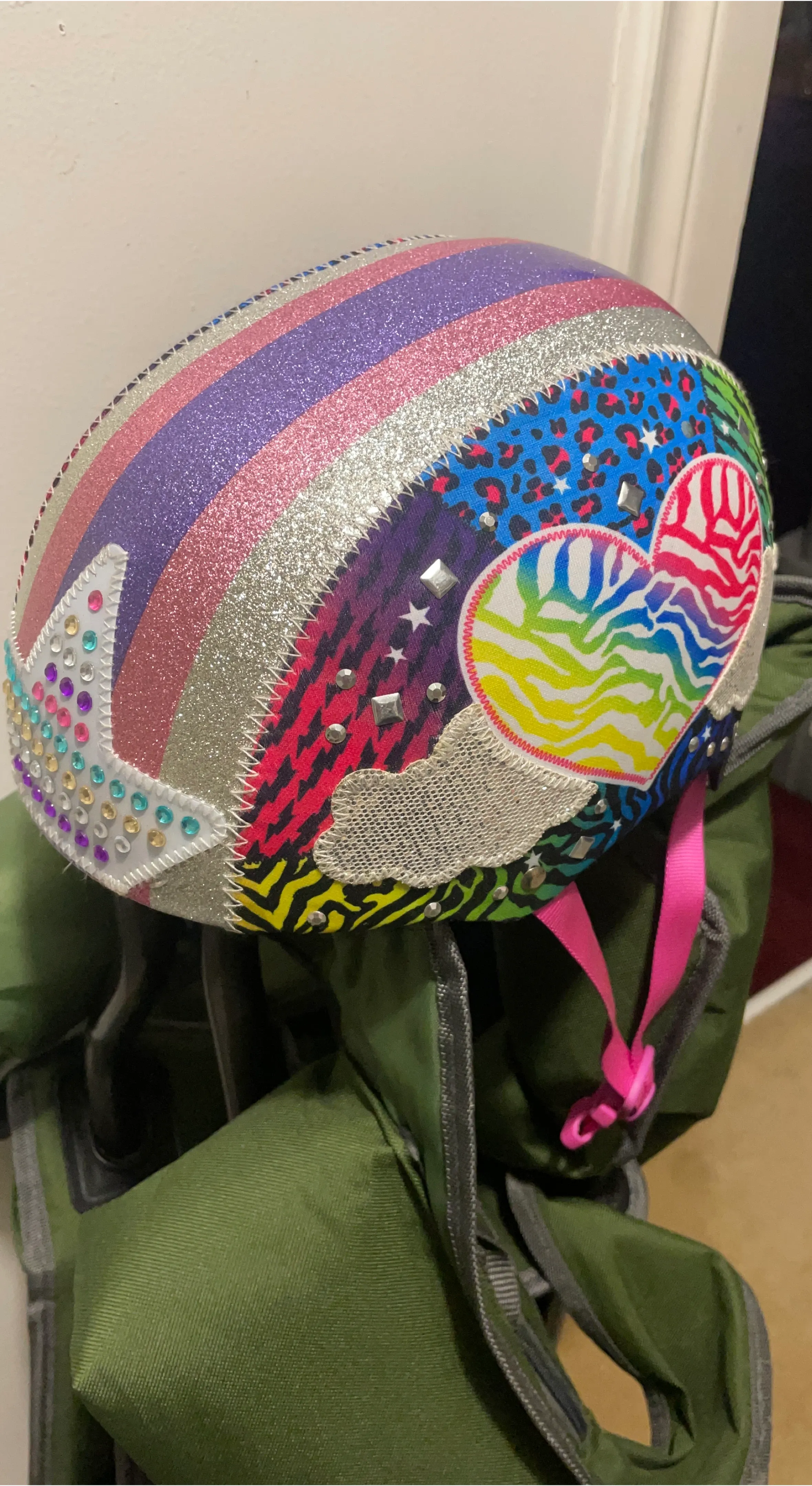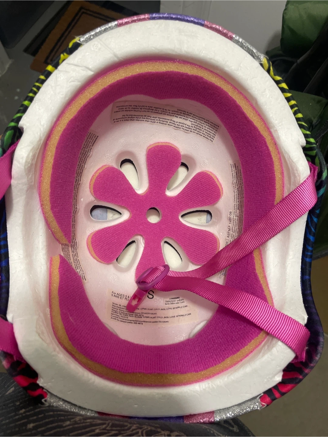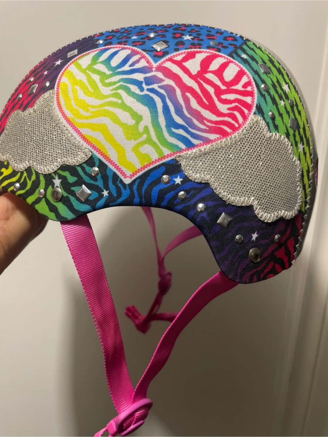 Colorful Sparkle Heart helmet for kids. Adjustable straps for a secure fit. This helmet's size is small. A great safety accessory for cycling!