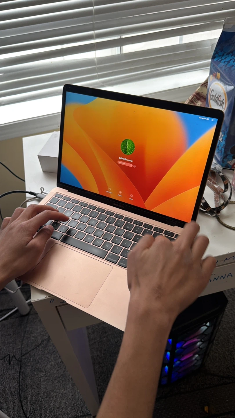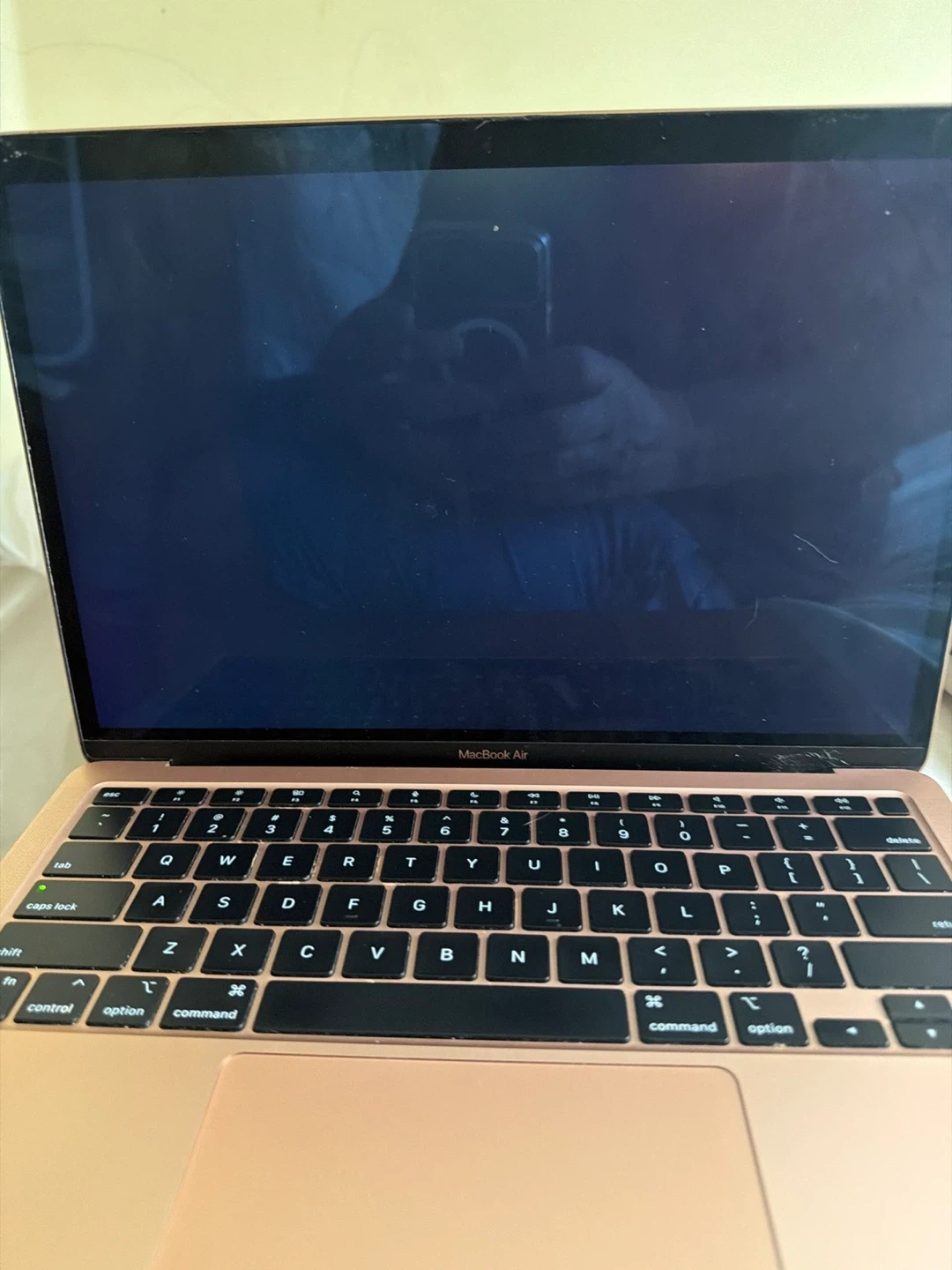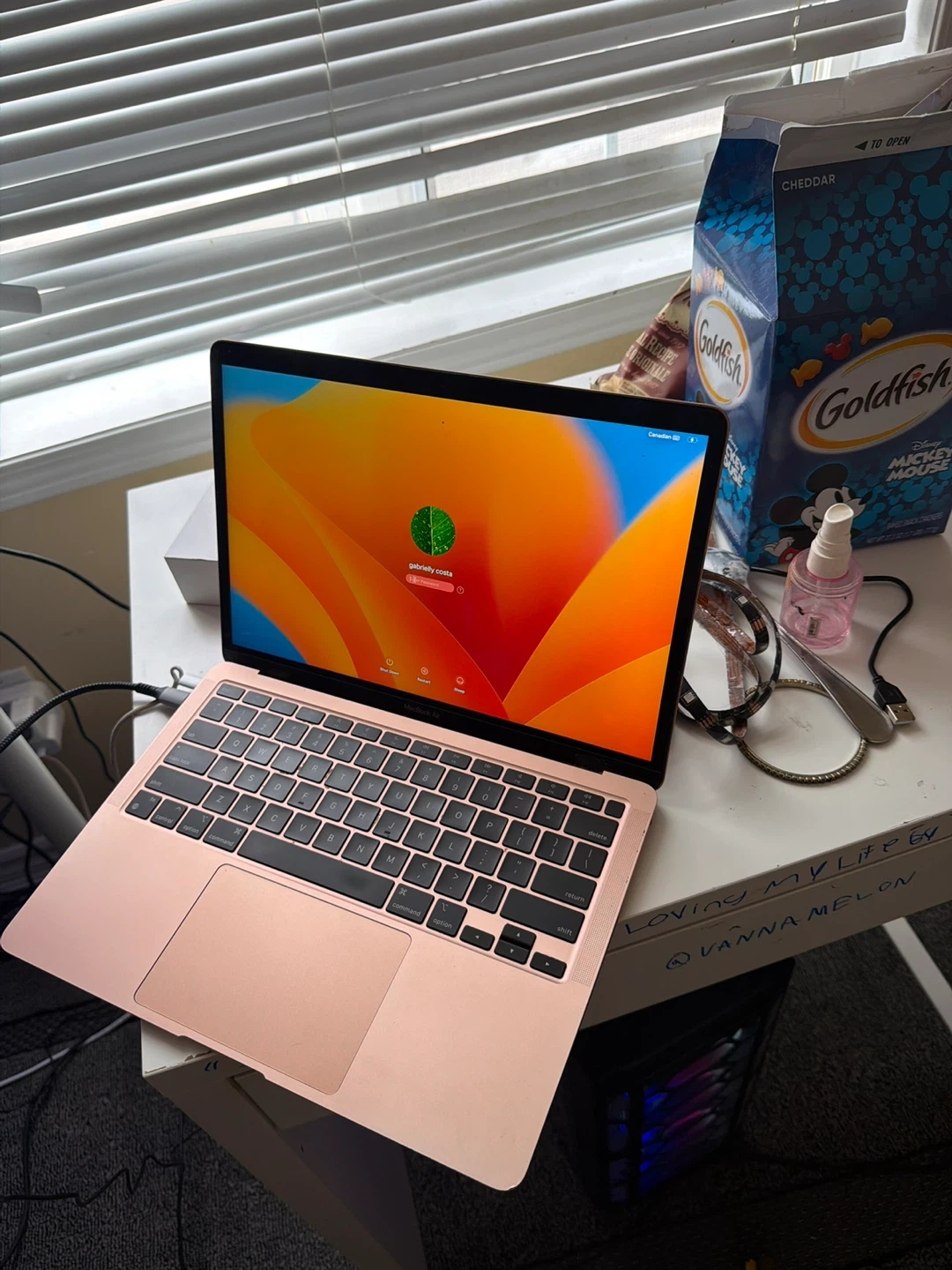 This is a rose gold Apple MacBook Air laptop. It's a great portable device for everyday tasks. It comes with a 13-inch screen and a comfortable keyboard.