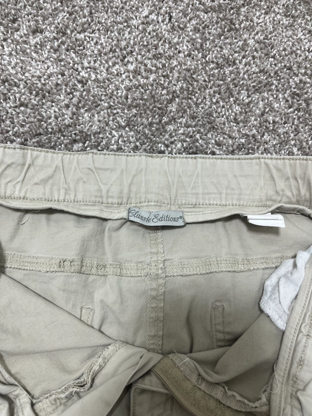 This is a women's khaki skirt from Classic Editions. It features an elastic waistband and a zipper and button closure. The material is a cotton blend.