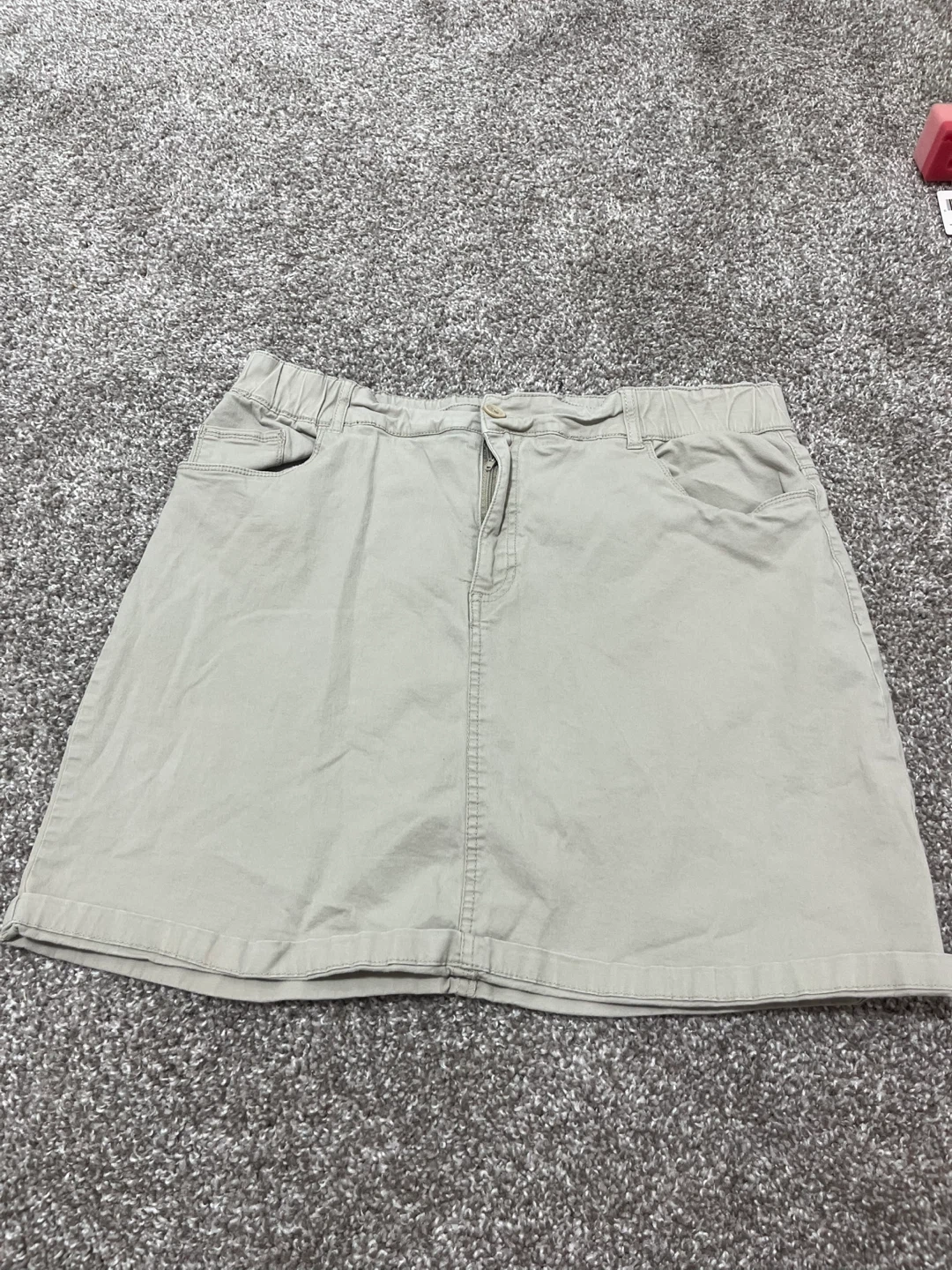 This is a women's khaki skirt from Classic Editions. It features an elastic waistband and a zipper and button closure. The material is a cotton blend.