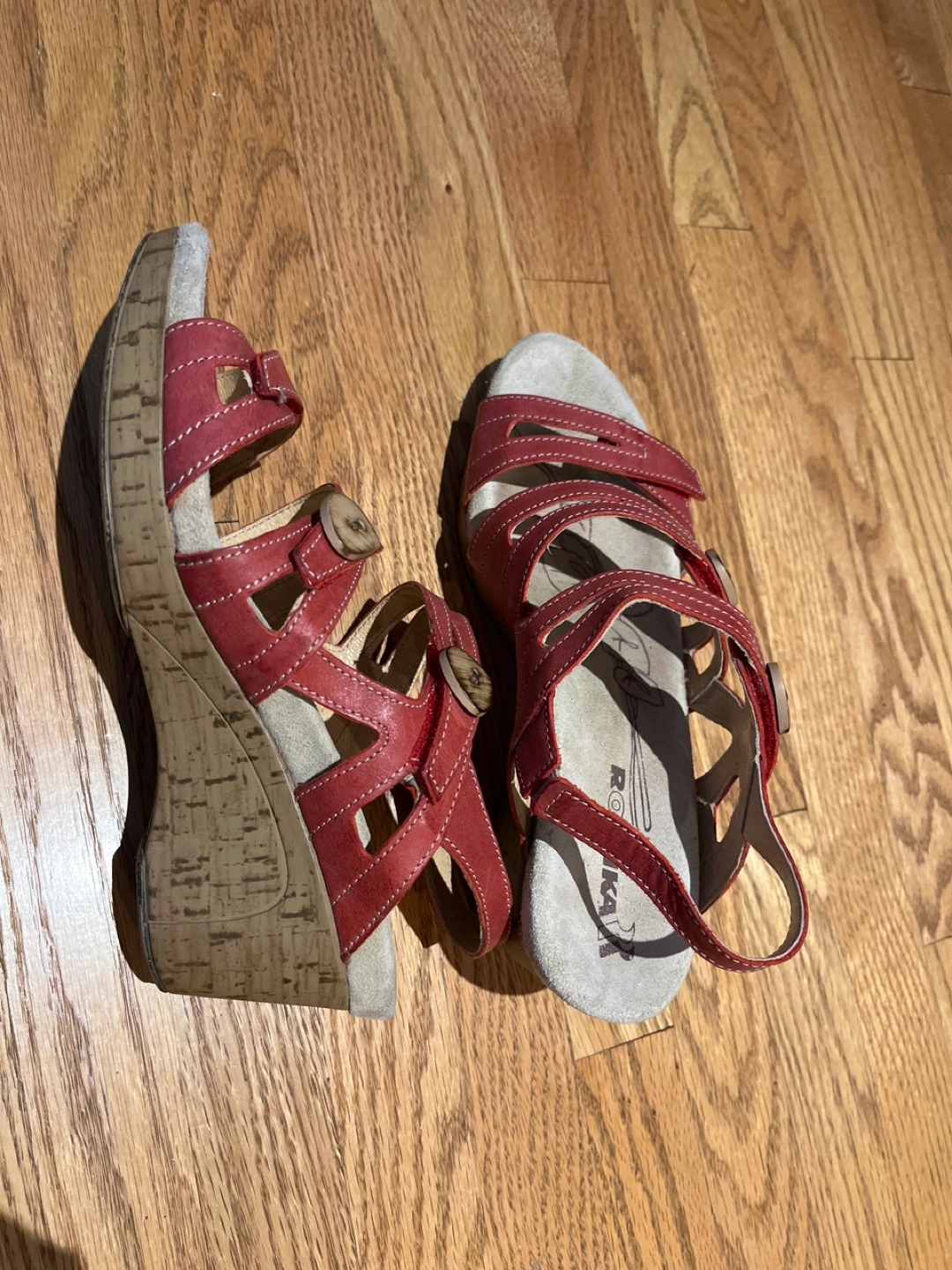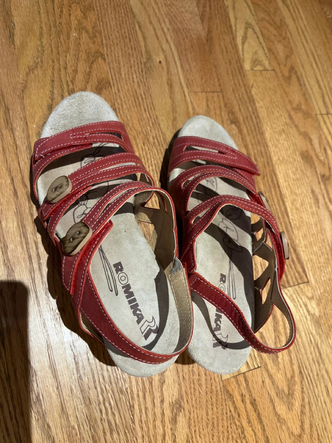 Selling a pair of Romika red wedge sandals. They show some signs of wear, but are still in good condition for everyday use.