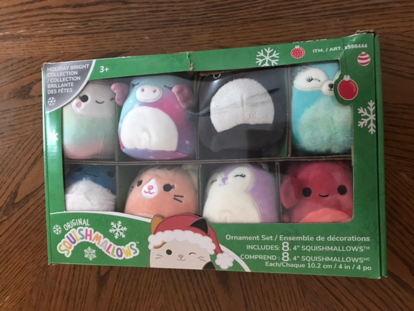 Selling a super cute Squishmallows Ornament Set from the Holiday Bright Collection! This set includes 8 adorable, small Squishmallows, each about 4 inches in size. They're perfect for decorating or just adding some cuddly cheer to your space. Excellent condition.