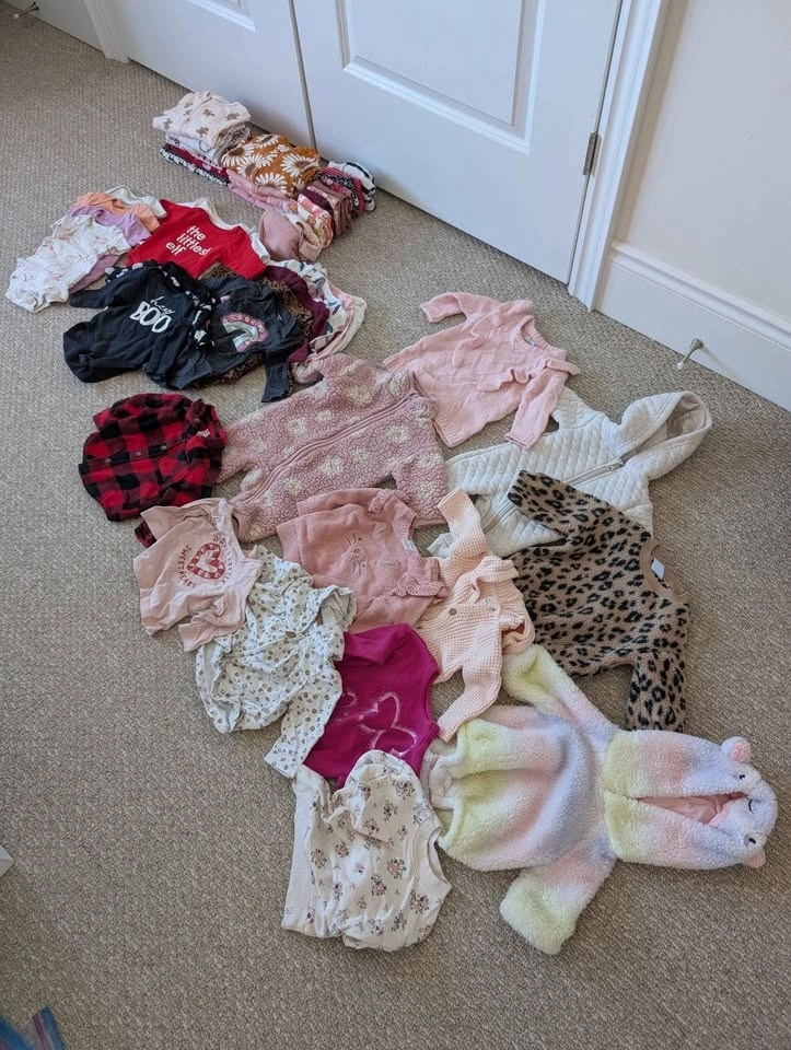 All in very good condition. I can sell all together or pieces. Great for any moms expecting in the fall! 11x pants (2x Christmas, 1x Halloween), 4x sleepers, 6x Christmas sleepers, 10x long sleeve bodysuits (2 Christmas, 2 Halloween), 4x short sleeve bodysuits, 1x Halloween unicorn costume, 8x long sleeve/sweaters, 2x jumpsuits, 1x pink dress sweater. Pickup in Kleinburg (near Major Mackenzie/Highway 27). I have more listings with more sizes and non-clothing items!