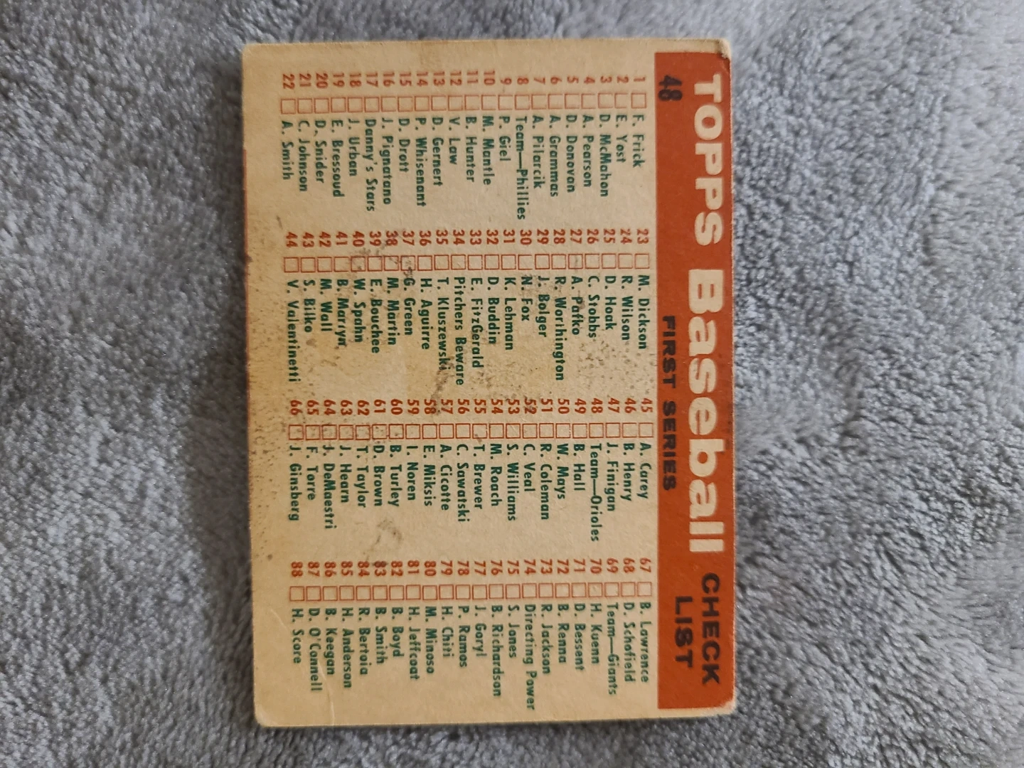 Vintage 1959 Topps baseball card featuring a checklist of players. It shows the Baltimore Orioles team photo on the front. Card number 48. This card lists player names and their corresponding numbers for checking.