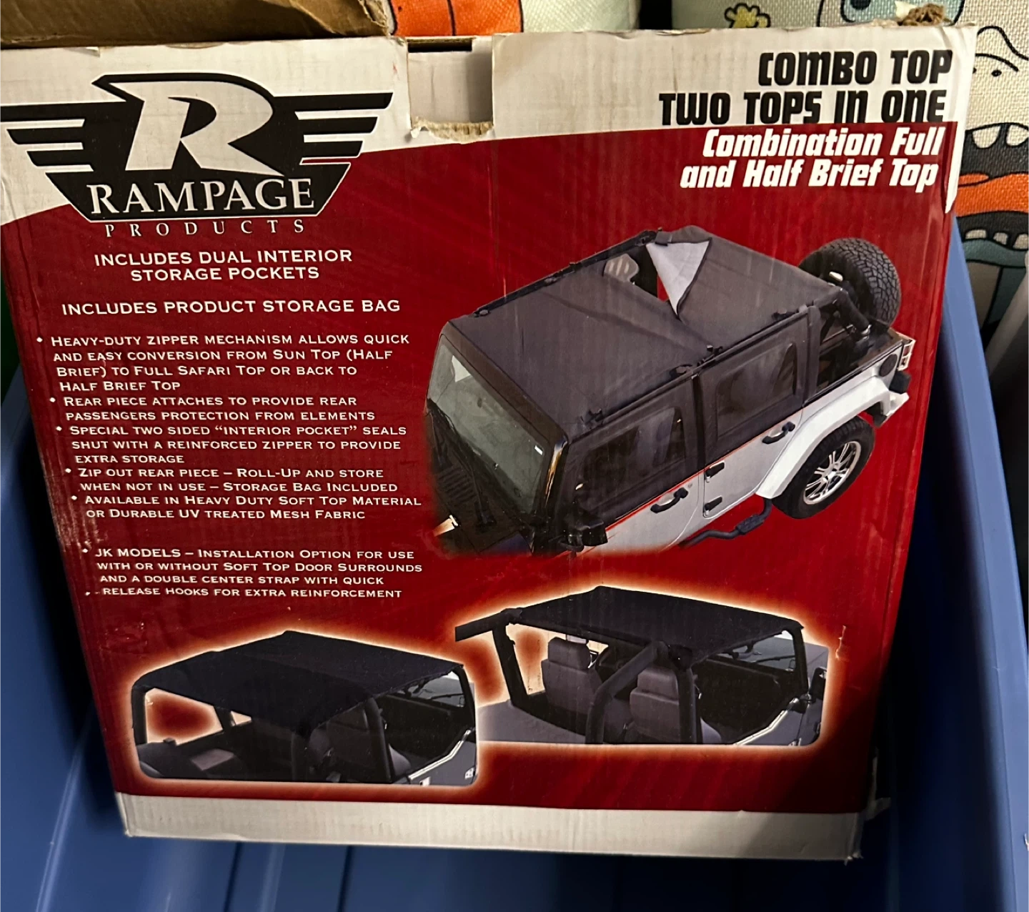 This is a Rampage Products combo top designed for a 07-15 Jeep Wrangler Unlimited. It offers both full brief top and half brief top configurations. Includes interior storage pockets and a product storage bag.