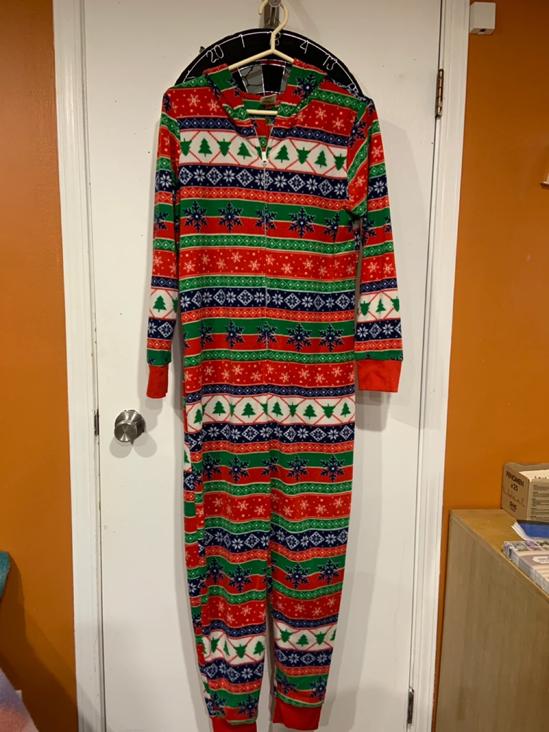 Cozy festive hooded onesie pajamas for those cold winter nights. Made of 100% polyester fleece for ultimate comfort. Perfect for lounging around the house!