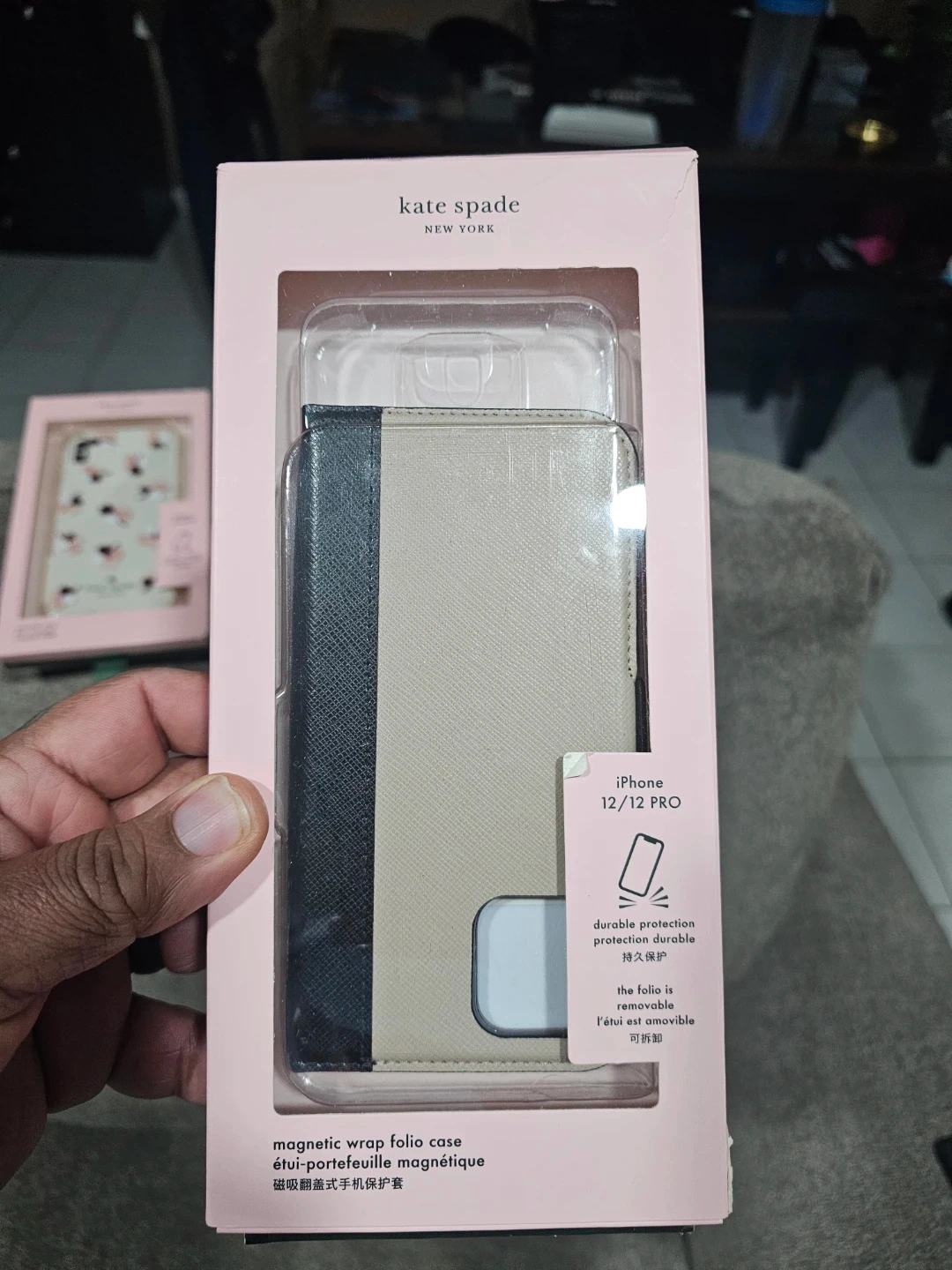 Kate Spade magnetic wrap folio case for iPhone 12/12 Pro. Features durable protection and a folio that is removable. Includes original packaging.