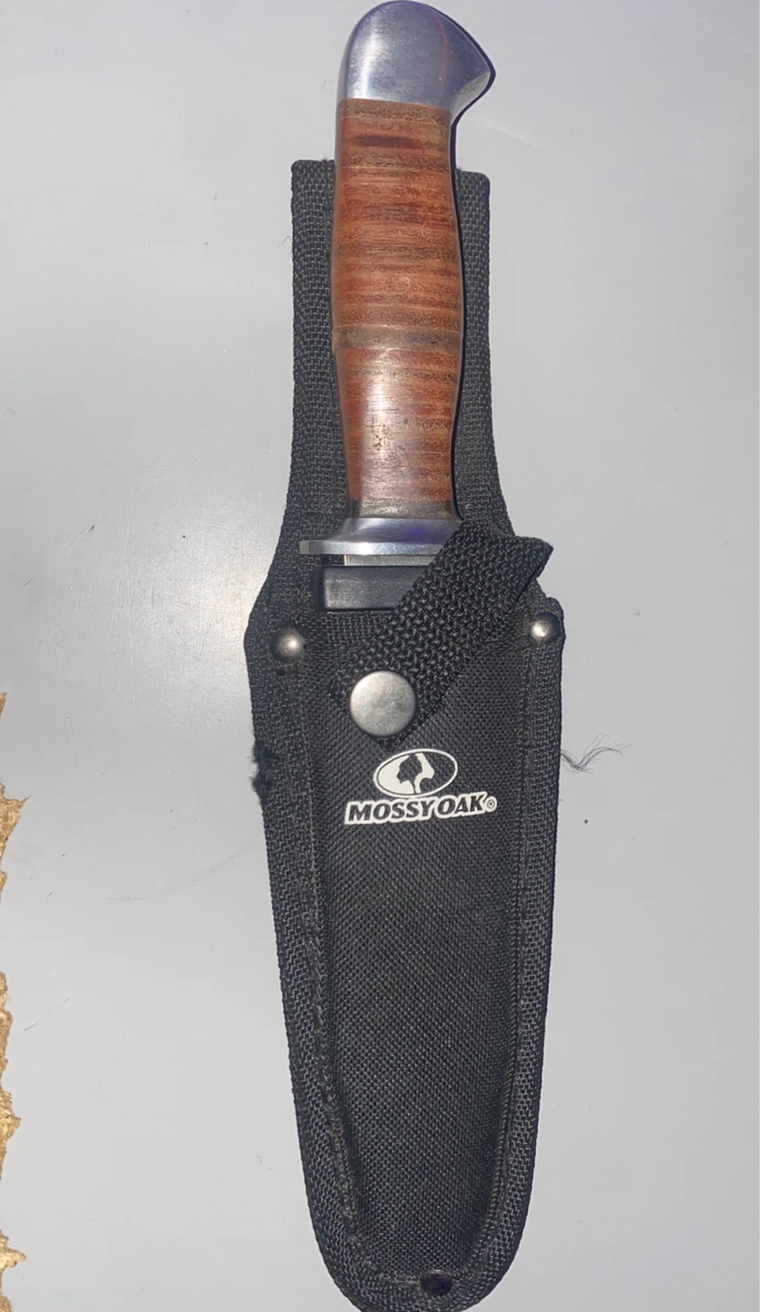 This is a Mossy Oak fixed blade knife. It features a leather-wrapped handle and comes with a black nylon sheath for easy carrying. The sheath has a snap closure to secure the knife.