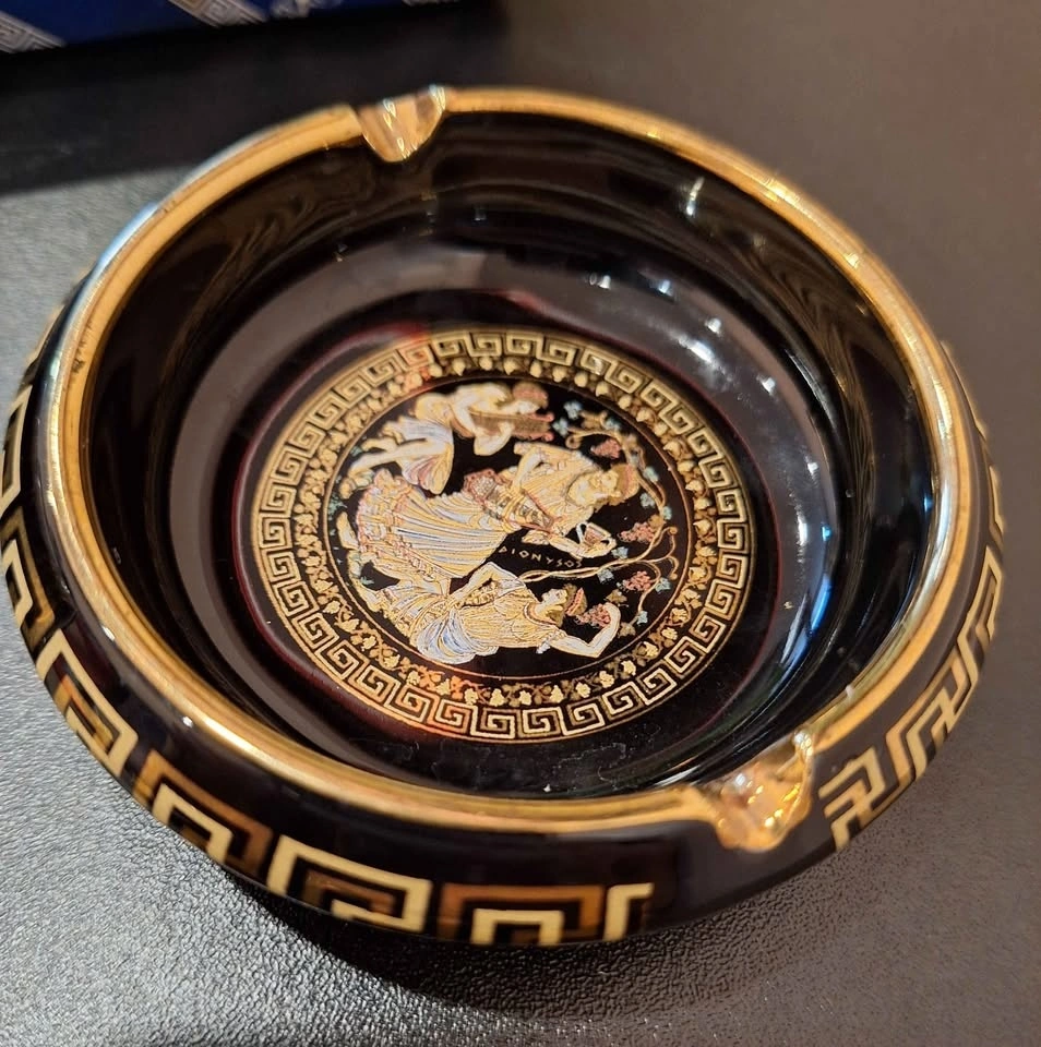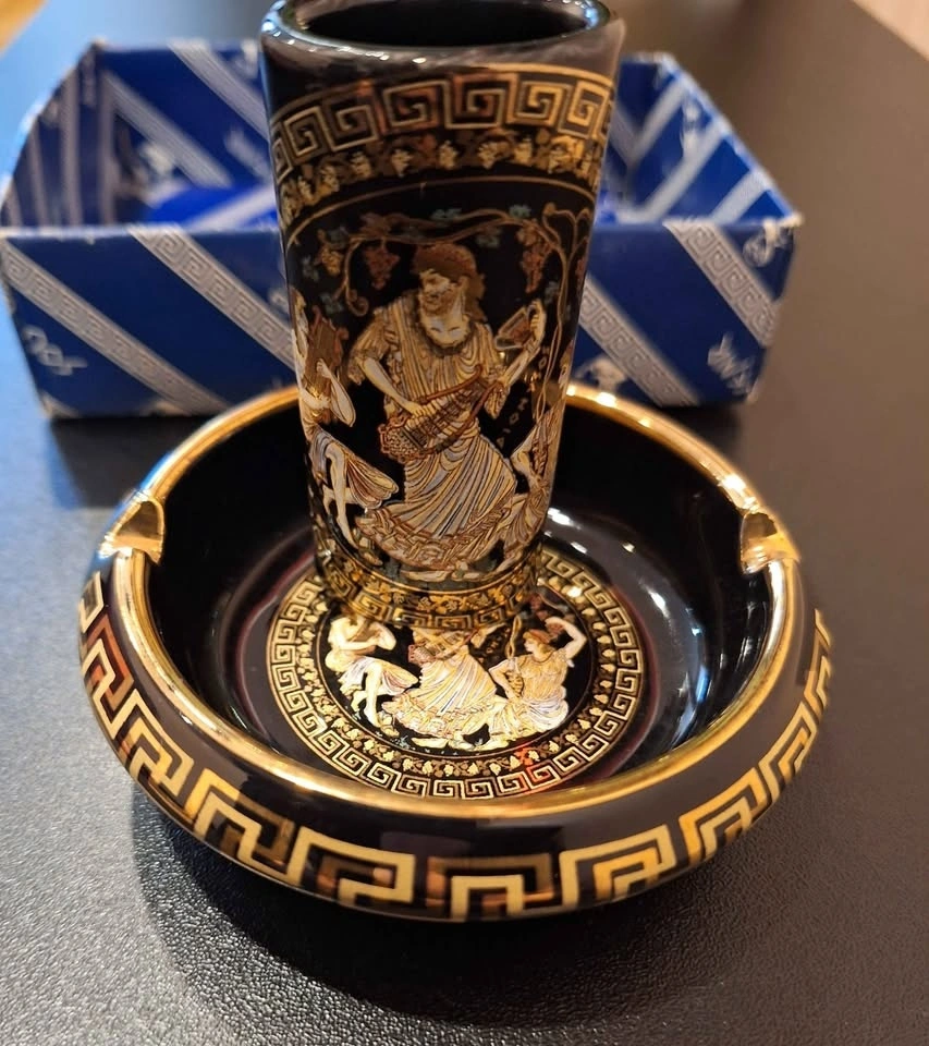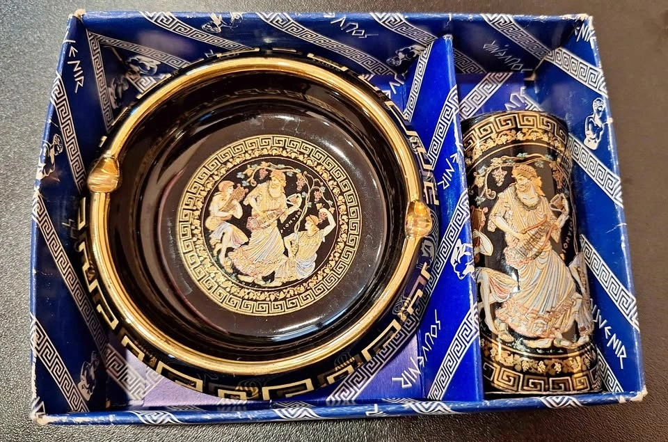 This beautiful vintage Greek ashtray and lighter set by Special Fintias is a stunning example of mid-century craftsmanship. Hand made in Greece and decorated with genuine 24K gold detailing, it features classical ancient Greek motifs with finely painted mythological scenes. Both the ashtray and lighter showcase deep black ceramic glaze adorned with intricate gold Greek key borders and colorful enamel accents. The imagery captures figures from Greek mythology, reflecting elegance, heritage, and a timeless aesthetic. A sophisticated and decorative set — perfect for collectors of Greek art, vintage barware, or mid-century smoking accessories. Ashtray: 3.5" Diameter. Good vintage condition with minimal signs of age. The gold trim and design remain vibrant and well-preserved.