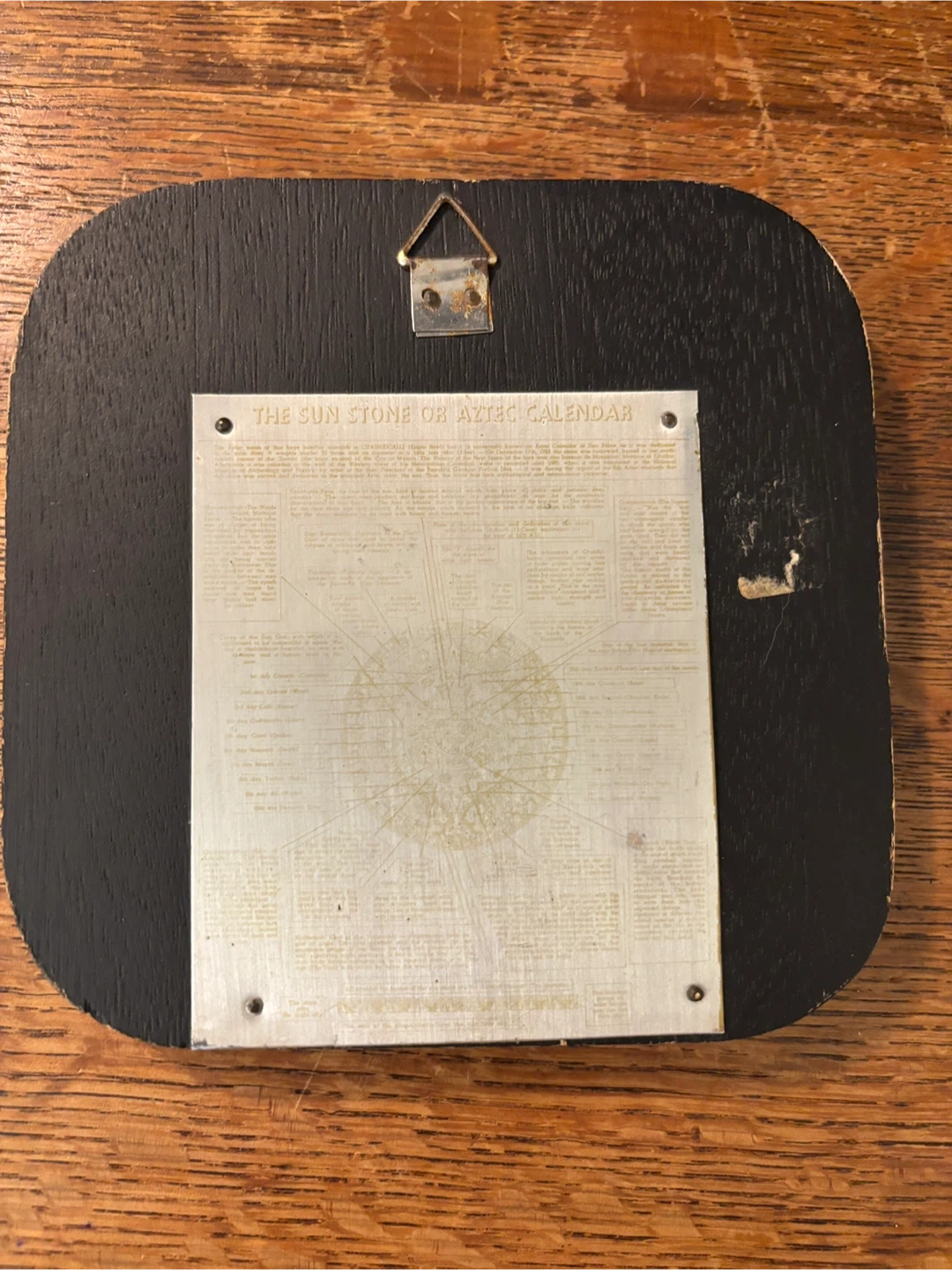 Decorative wall hanging featuring the Aztec Sun Stone Calendar design. The back includes description text. Made of wood with a hager on the back. Vintage condition with some wear on the edge (see pics).