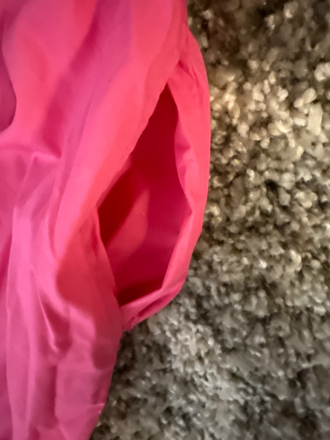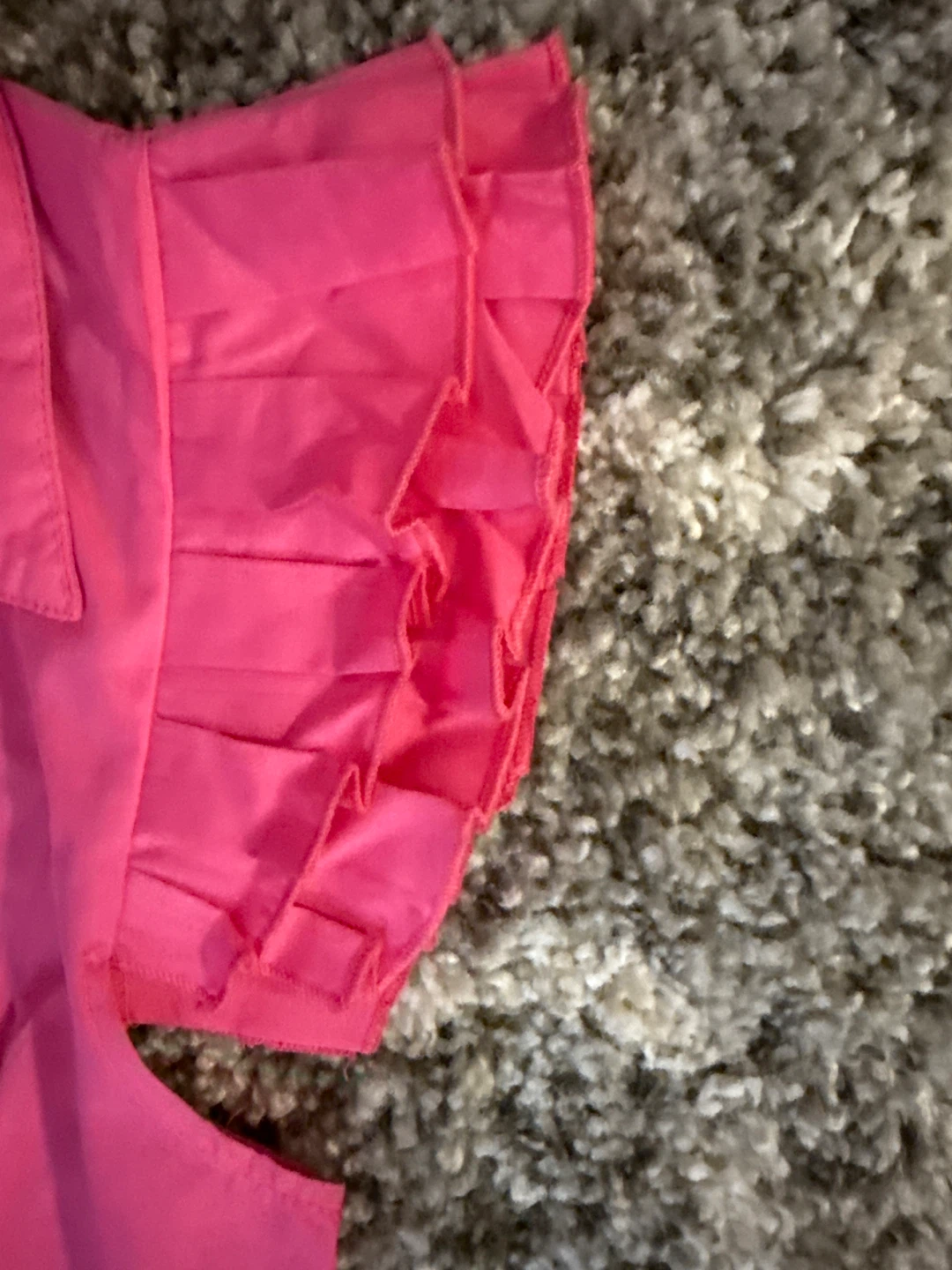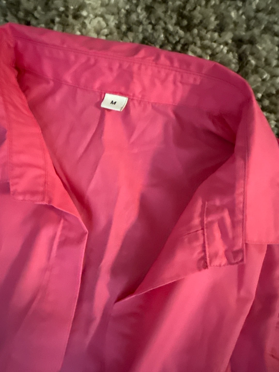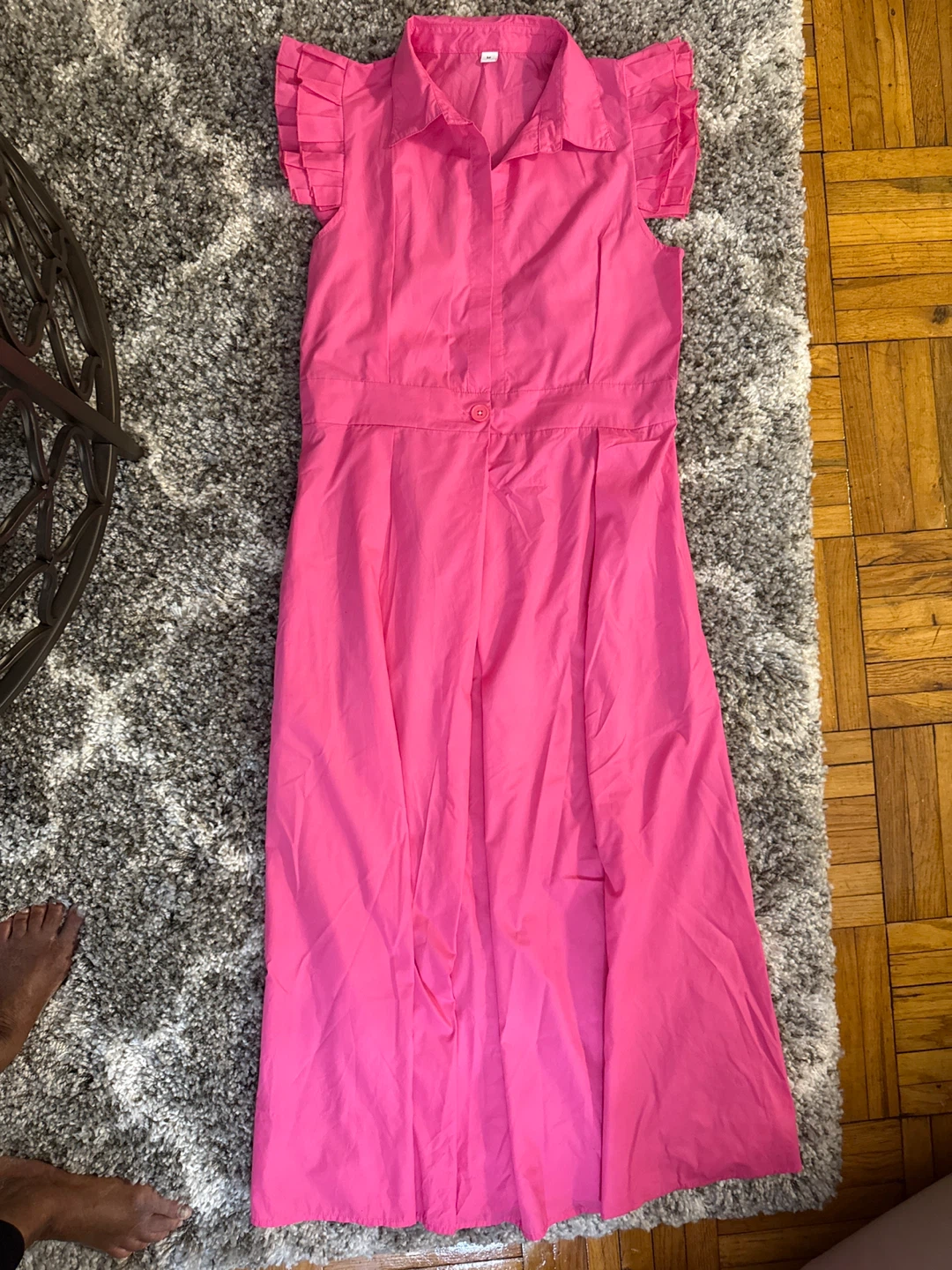 This bright pink button-up dress features a collared neckline and short, ruffled sleeves. It has pockets on the sides and a button closure down the front. Size medium.