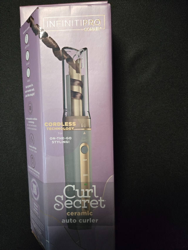 This InfinitiPRO Curl Secret auto curler delivers salon-style curls on the go with its cordless ceramic barrel and dual temperature control. No cords, no hassle—just insert your hair, press a button, and watch it curl like magic. Perfect for travel or quick touch-ups. Key Features: Cordless ceramic technology for safe, even heat 200°C max temperature with two heat settings for different hair types Automatic curling chamber for effortless styling Rechargeable and portable—great for travel Ideal for defined, loose, or wavy curls Comes with original box, instructions, and charging cable