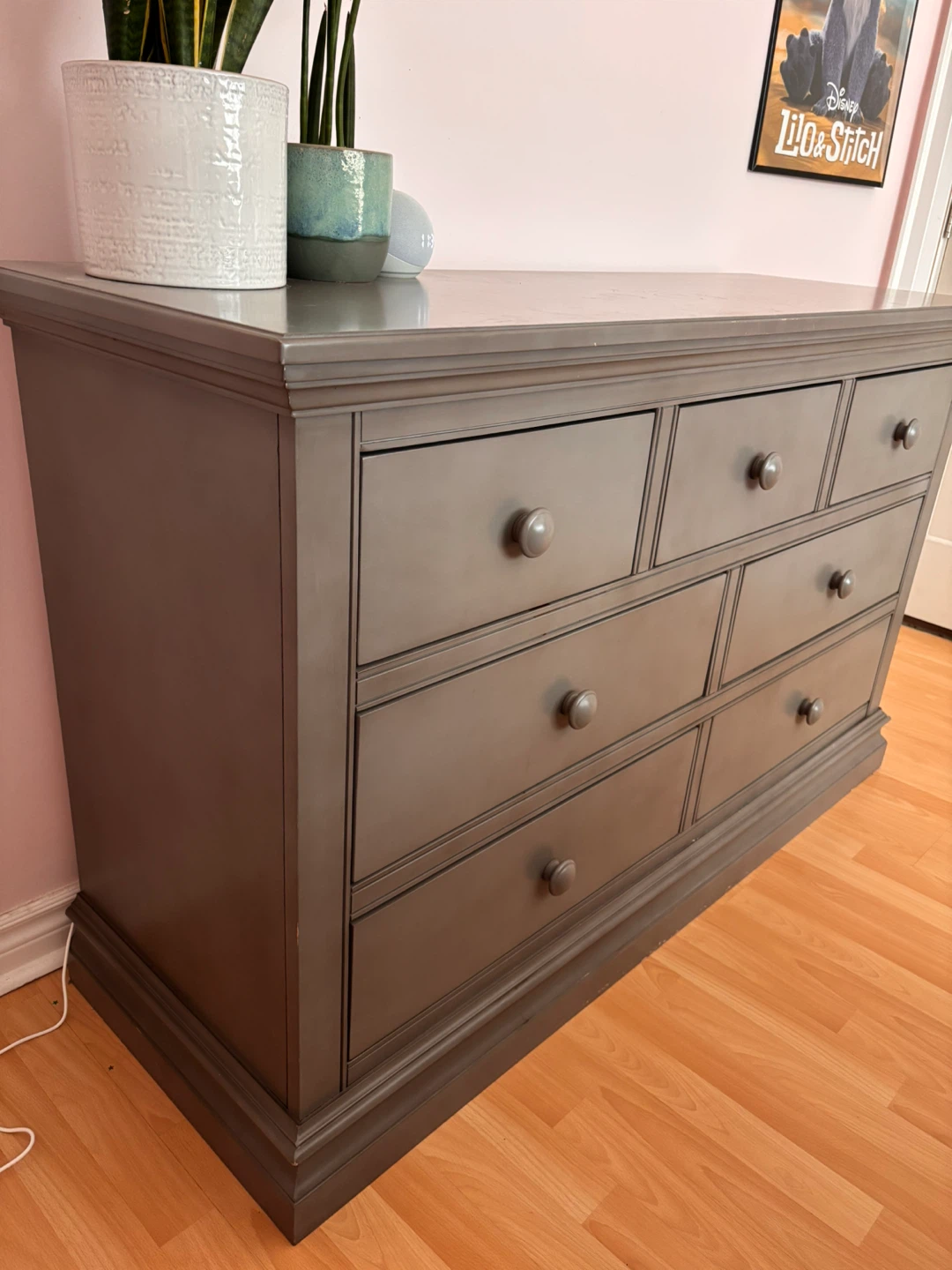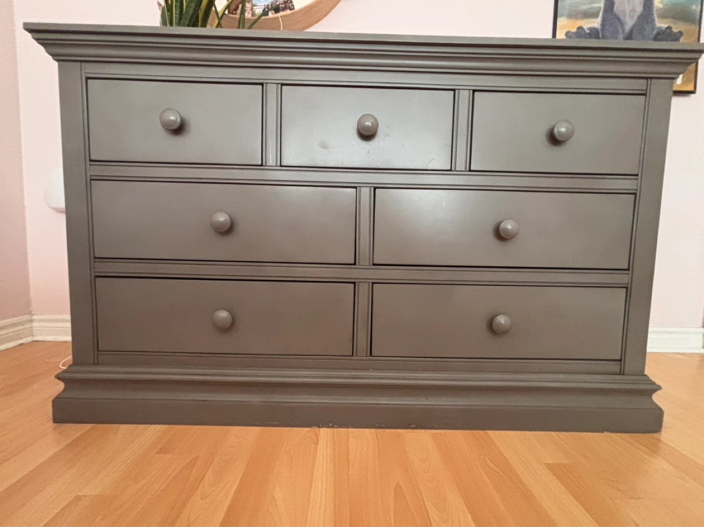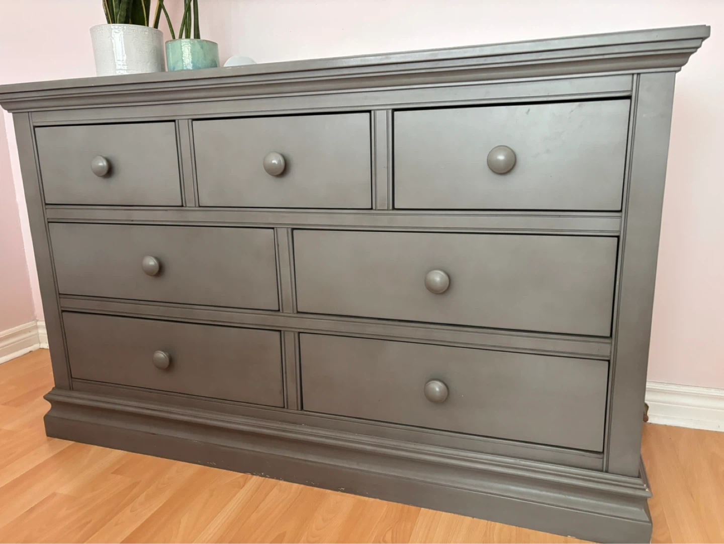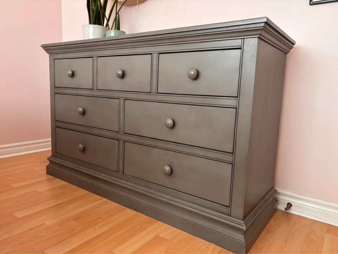 Grey dresser with seven drawers. It's made of wood and has round knobs. Ample storage space for your clothes!
