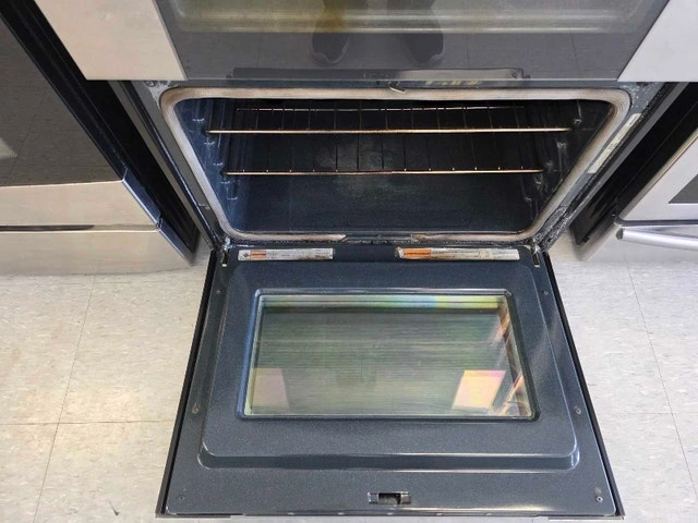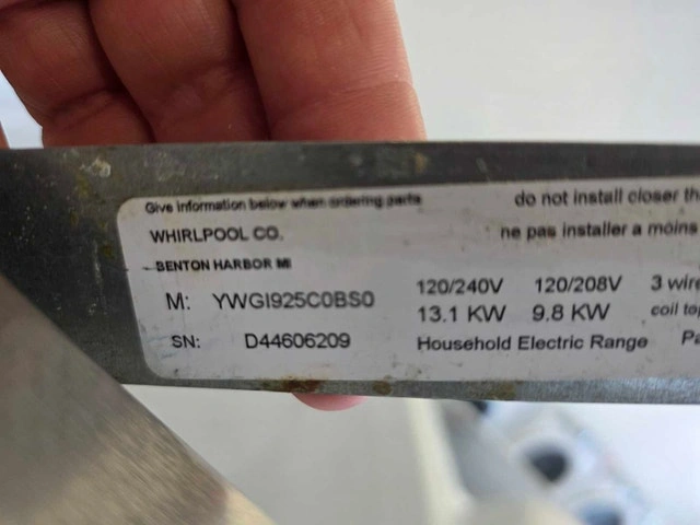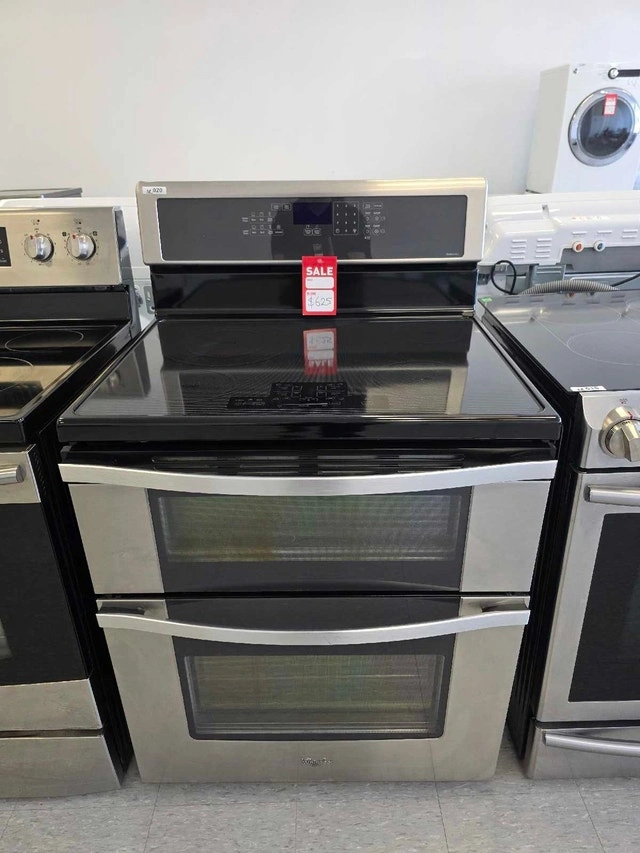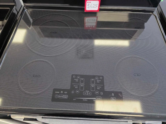 Whirlpool Double Oven Induction Range – $625 CAD. This is a Whirlpool YWGI925C0BS0 model. It's 30" wide, stainless steel, and freestanding. It has a total capacity of 6.7 cu. ft. across two ovens: an upper oven with 2.5 cu. ft. and a lower oven with 4.2 cu. ft. that features convection. The cooktop is AccuHeat™ Induction with 4 elements, including an 11" Induction Boost (3,700W) that boils water much faster. The cooktop surface stays cool and is easy to clean. It also features the AccuBake® system for consistent baking, TimeSavor™ convection cooking, and a self-cleaning oven. The lower oven has an EasyView™ extra-large window. Other features include Rapid Preheat, Keep Warm, Control Lock, and Sabbath Mode. It's an electric range (240V / 13.1 kW).