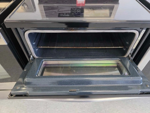 Whirlpool Double Oven Induction Range – $625 CAD. This is a Whirlpool YWGI925C0BS0 model. It's 30" wide, stainless steel, and freestanding. It has a total capacity of 6.7 cu. ft. across two ovens: an upper oven with 2.5 cu. ft. and a lower oven with 4.2 cu. ft. that features convection. The cooktop is AccuHeat™ Induction with 4 elements, including an 11" Induction Boost (3,700W) that boils water much faster. The cooktop surface stays cool and is easy to clean. It also features the AccuBake® system for consistent baking, TimeSavor™ convection cooking, and a self-cleaning oven. The lower oven has an EasyView™ extra-large window. Other features include Rapid Preheat, Keep Warm, Control Lock, and Sabbath Mode. It's an electric range (240V / 13.1 kW).