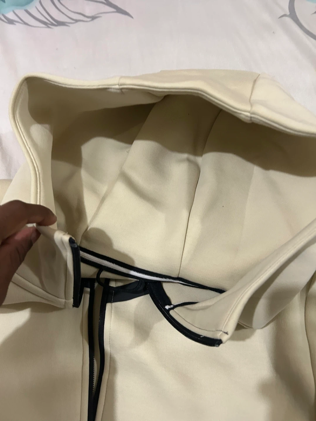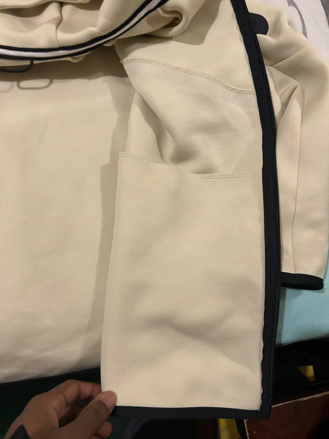 This is a Nike Tech Fleece zip-up hoodie in a light cream color. It features the signature Tech Fleece material and a full zipper closure. The hoodie includes multiple pockets for convenience. It's a comfortable and stylish piece for everyday wear.