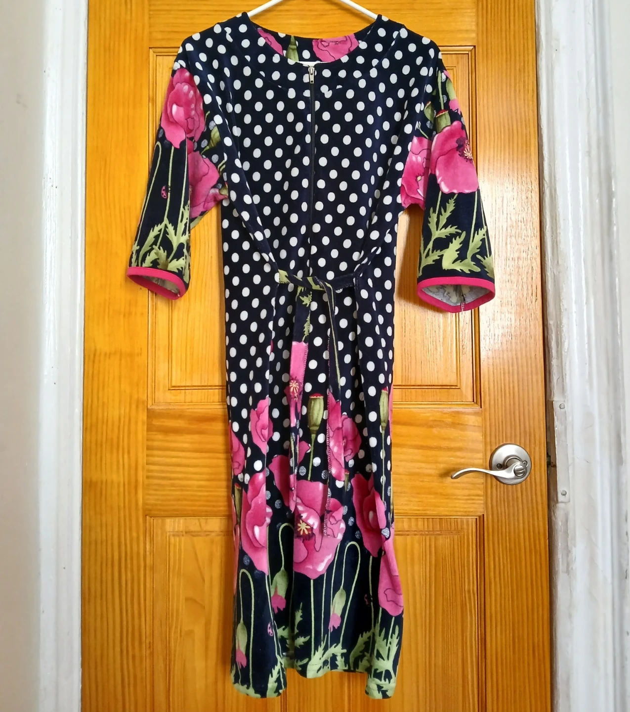 This robe features a navy background with white polka dots and a vibrant pink poppy floral print. It has a flattering tie waist and 3/4 sleeves with pink trim. A front zipper makes it easy to wear. Will keep you warm!