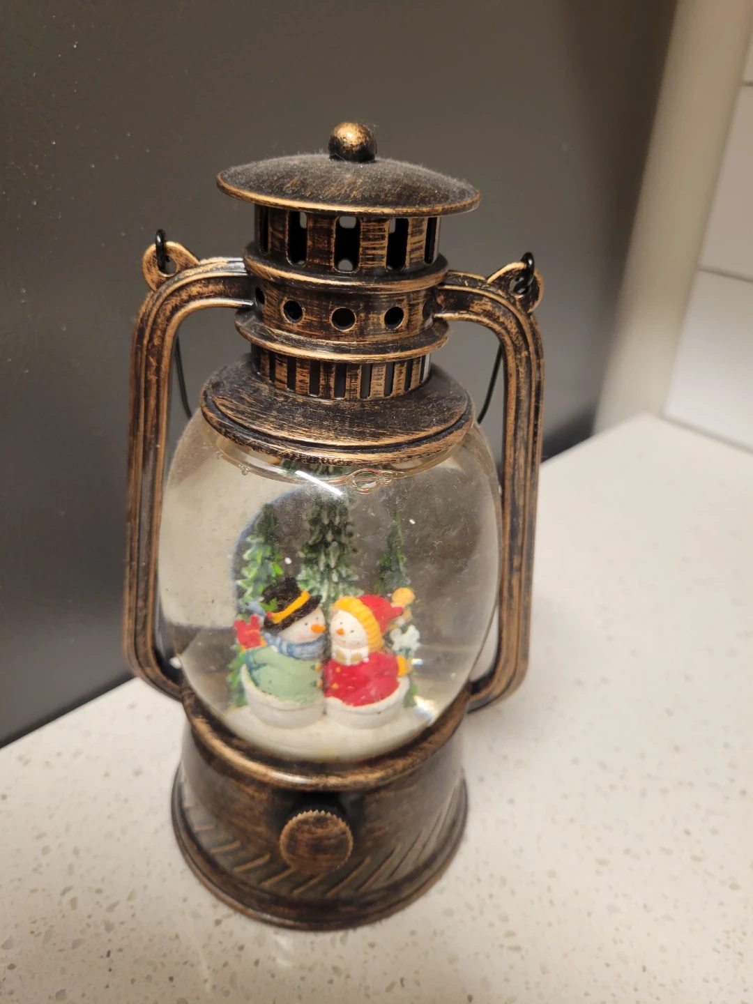 This charming lantern snow globe features two snowmen bundled up with a winter scene. It has a rustic, antique bronze finish. Adds a festive touch to any holiday decor!