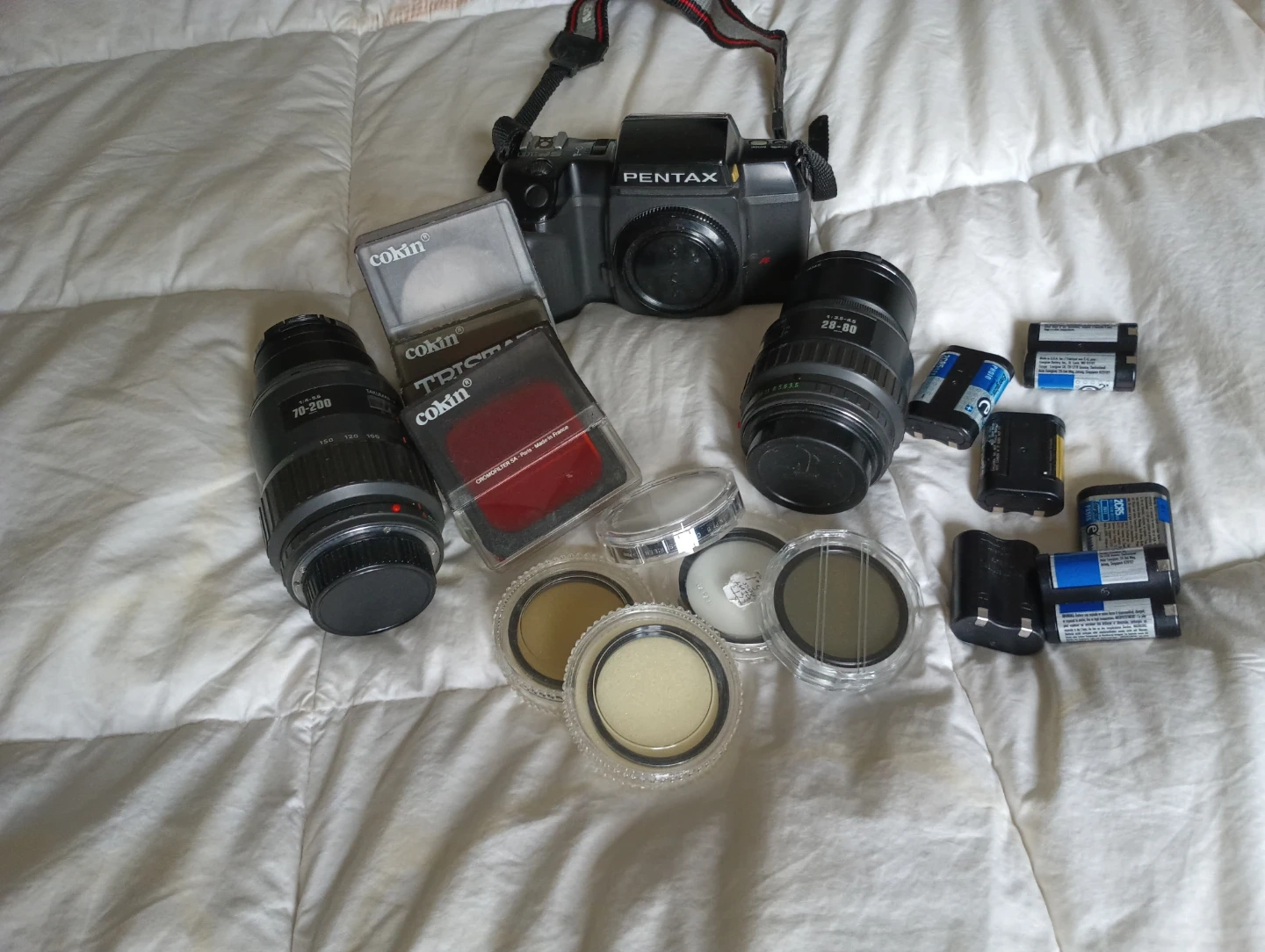 This Pentax camera comes with two lenses: a 70-200mm and a 28-80mm. It includes several Cokin filters and multiple batteries. This kit is perfect for photographers looking for versatile shooting options. Also includes some filters batteries are used for single photo shoots pick up and cash only
