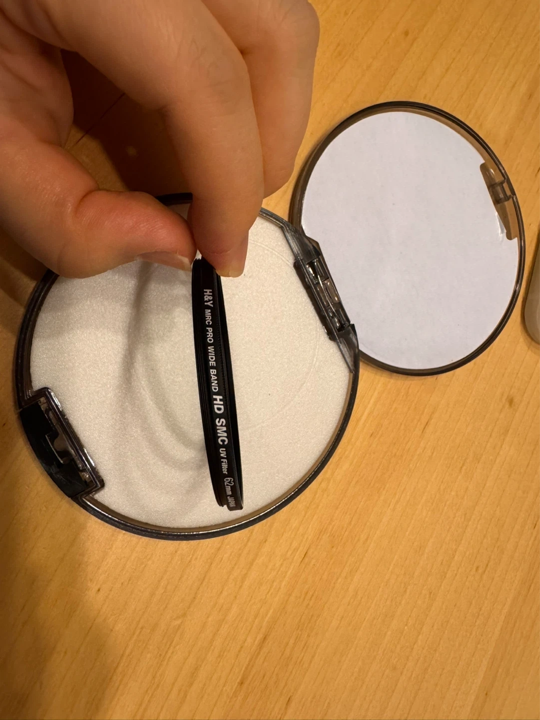 H&Y MRC PRO WIDE BAND HD SMC 62mm UV filter included in its protective case. This filter's purpose is to reduce UV light. It's designed for camera lenses.