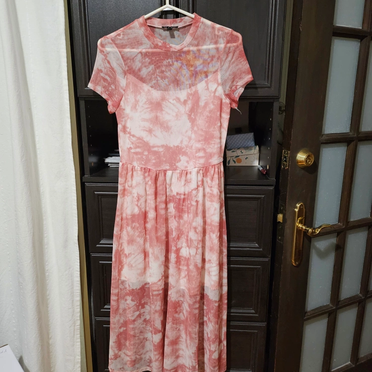 Beautiful pink tie-dye midi dress. Sheer mesh neckline and short sleeves. Relaxed fit. Size large.