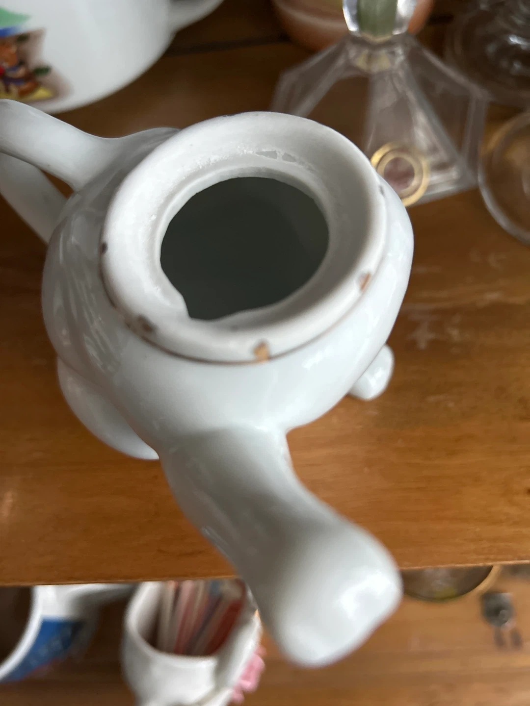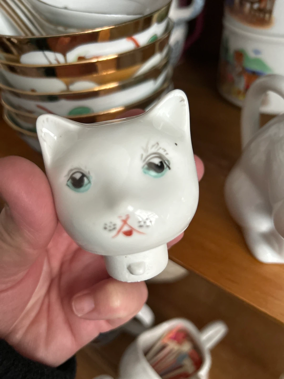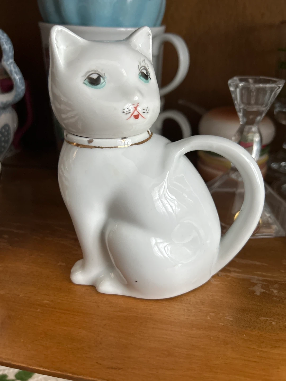 A charming white ceramic creamer pitcher shaped like a sitting cat. It features painted blue eyes and a delicate gold-tone trim around the neck. The lid is also shaped like the cat's head.
