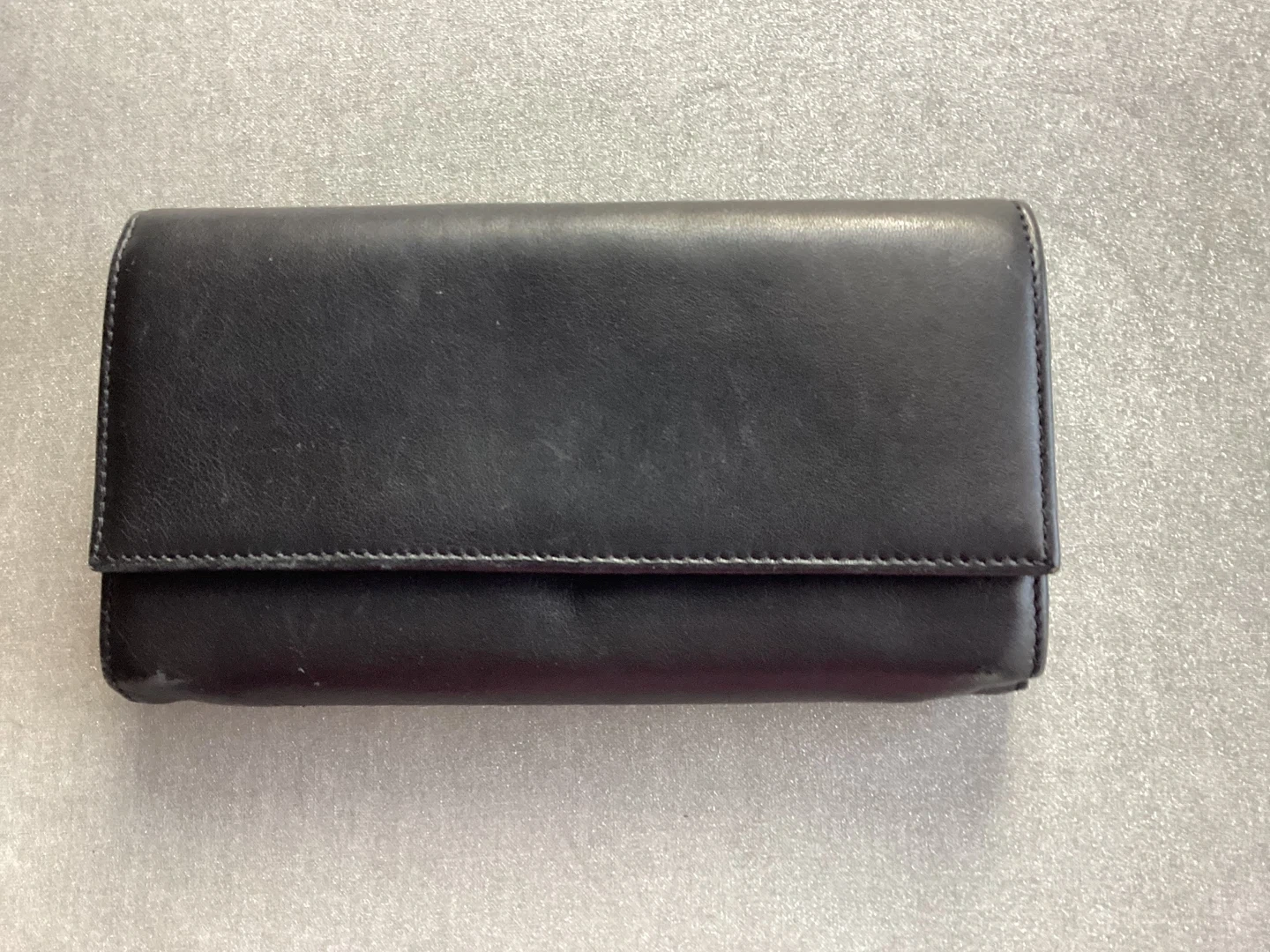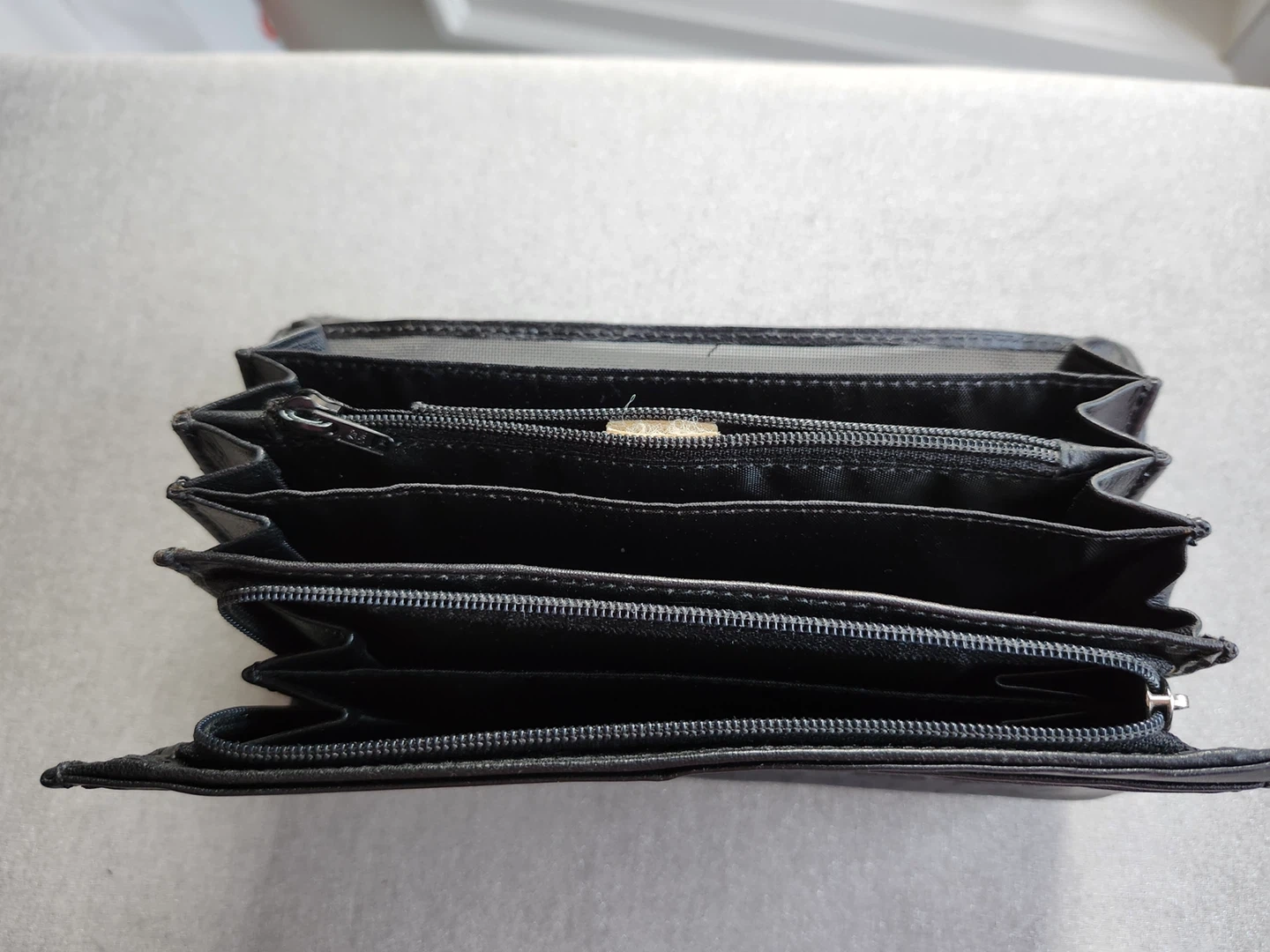 Danier Black Leather Wallet, some signs of wear, one of the zippers is broken but I have attached Velcro to fasten the pocket, approximate size 7 3/8” X 4” X 1”,