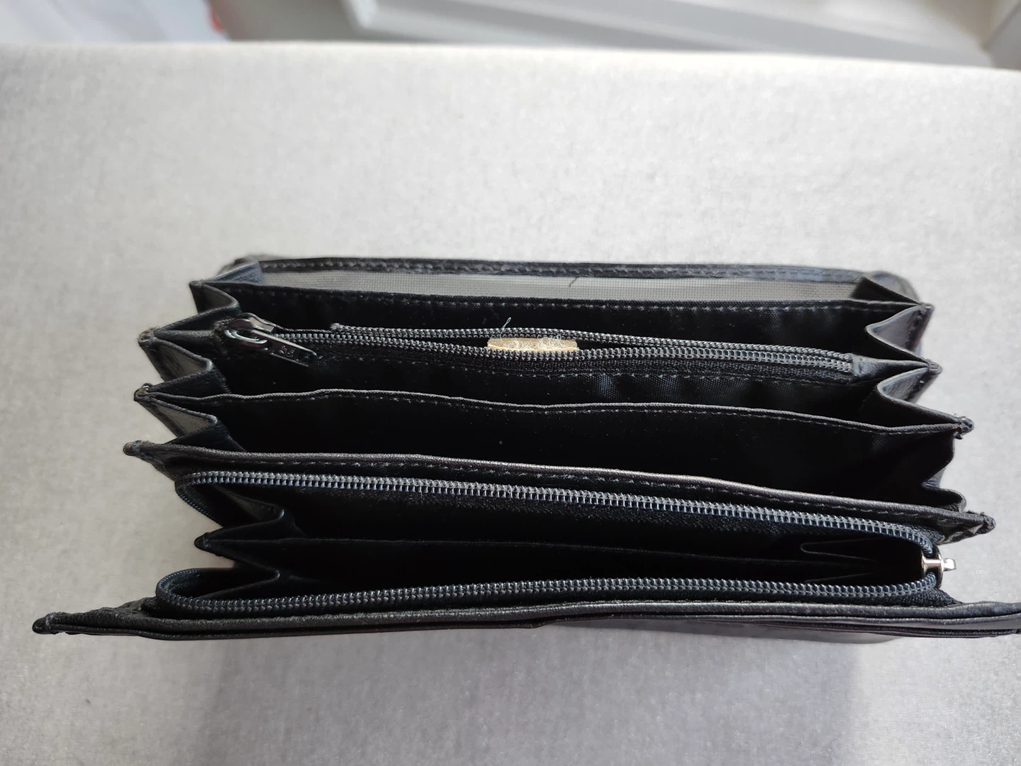 Danier Black Leather Wallet, some signs of wear, one of the zippers is broken but I have attached Velcro to fasten the pocket, approximate size 7 3/8” X 4” X 1”,