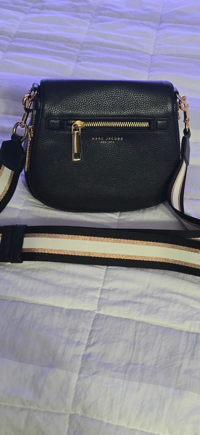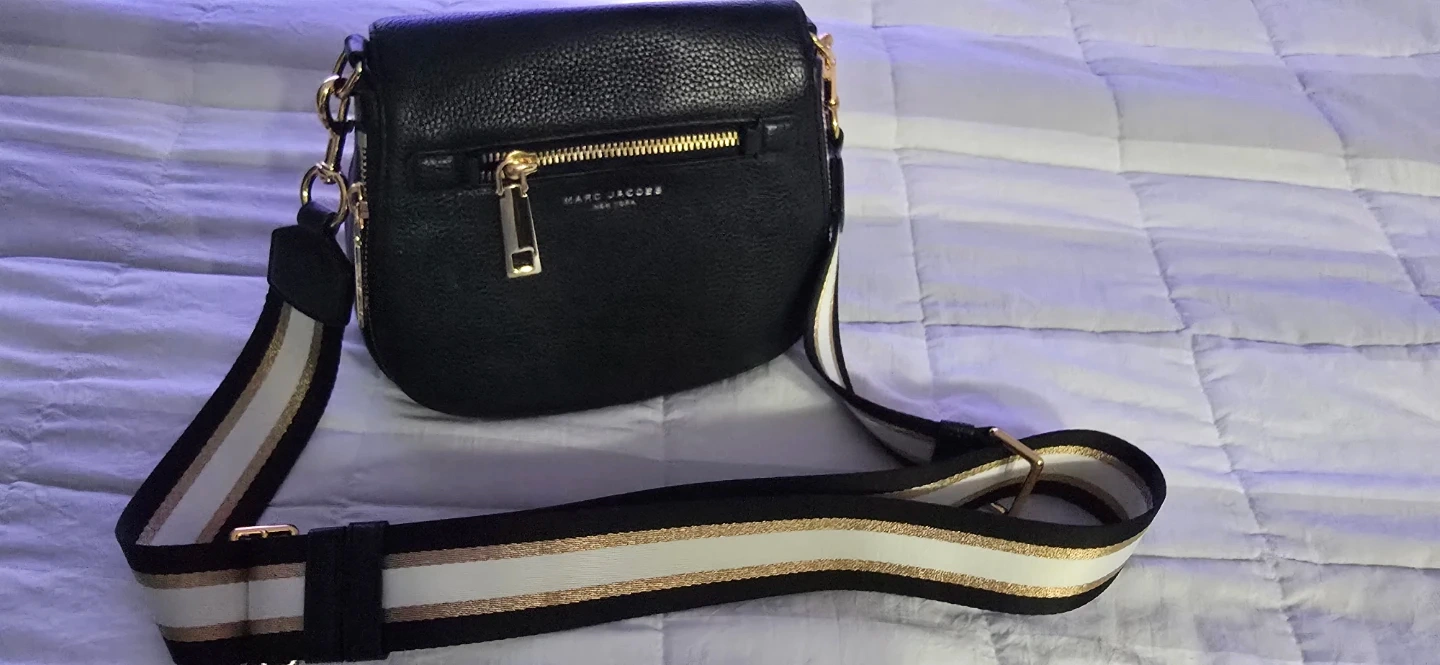 I'm selling a stylish black leather crossbody bag from Marc Jacobs! It's in great condition and features a zipper on the front. The strap is white with gold and brown stripes. Perfect for carrying your essentials in style!