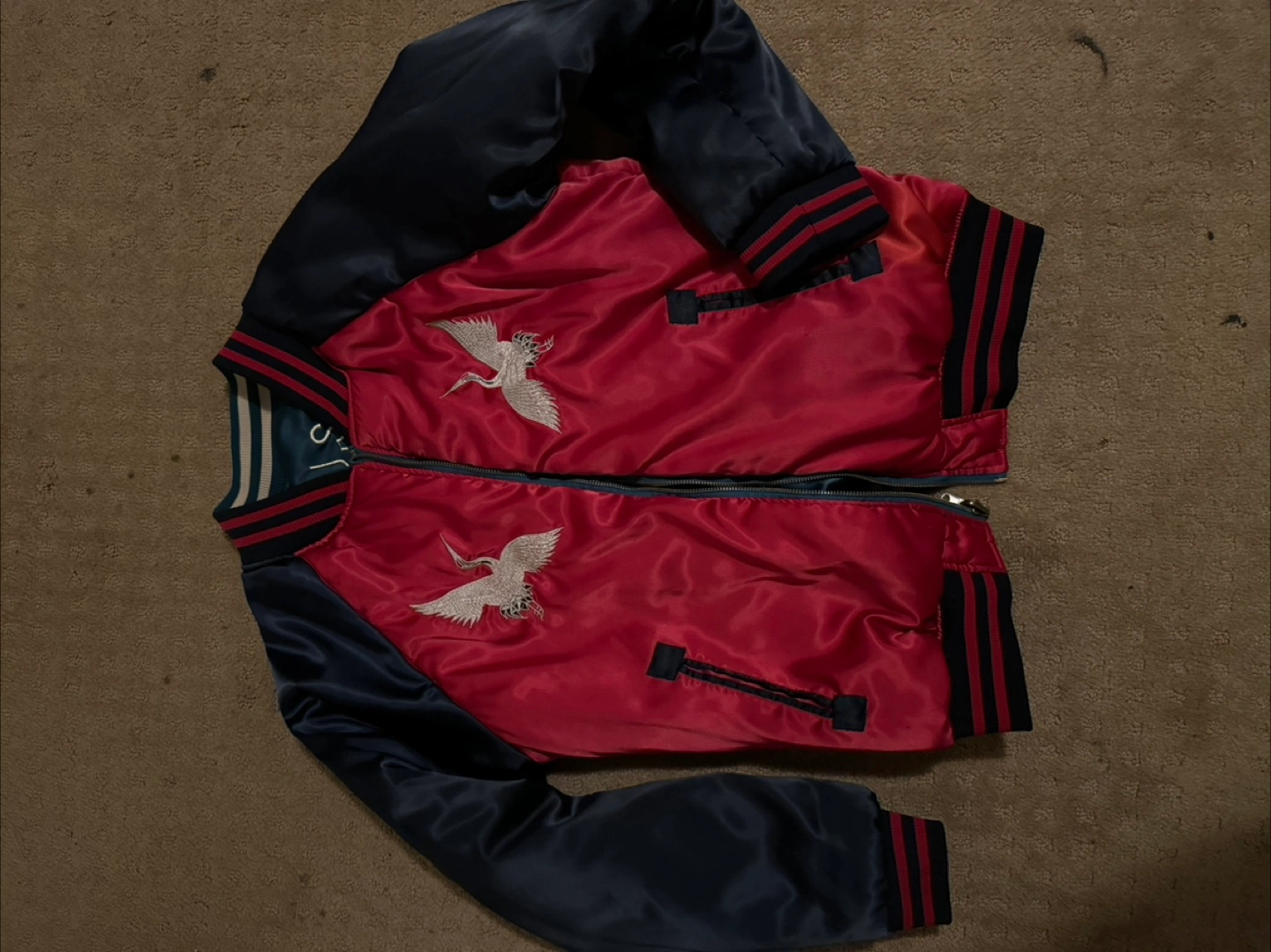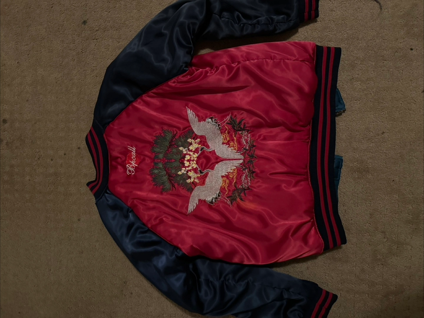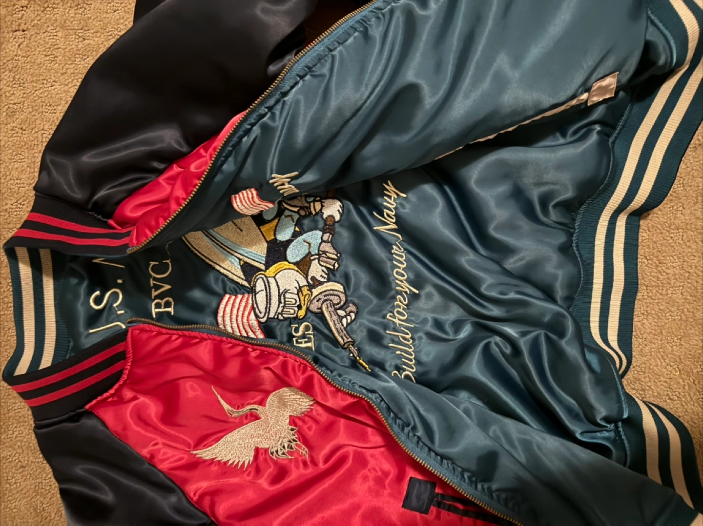 Unique reversible bomber jacket. Features embroidered designs. One side depicts a navy scene, the other showcases cranes. Features ribbed cuffs and collar. Excellent for collectors.