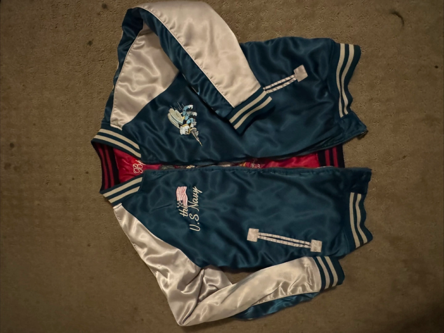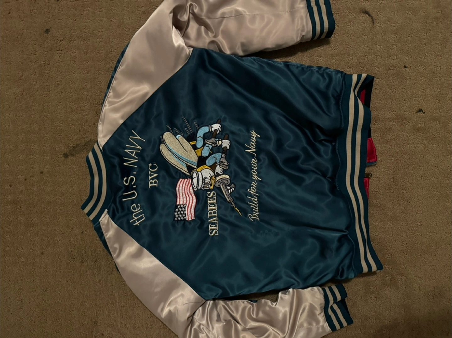 Unique reversible bomber jacket. Features embroidered designs. One side depicts a navy scene, the other showcases cranes. Features ribbed cuffs and collar. Excellent for collectors.