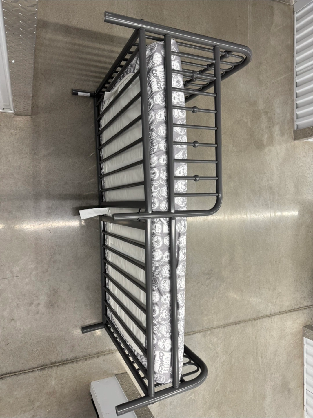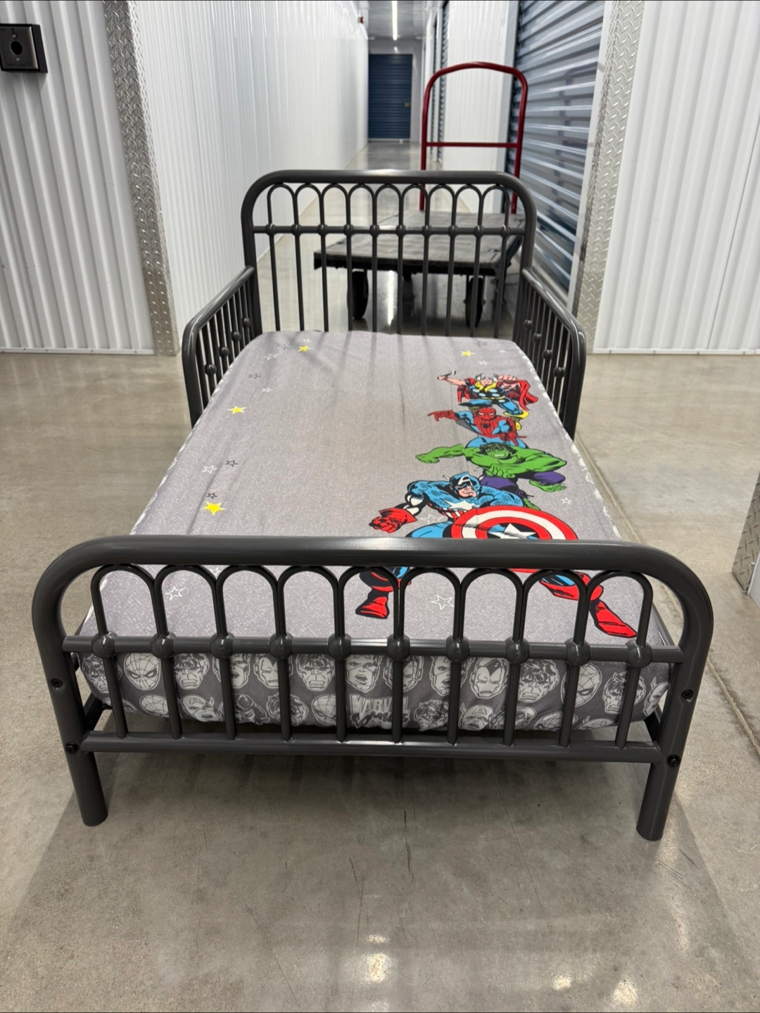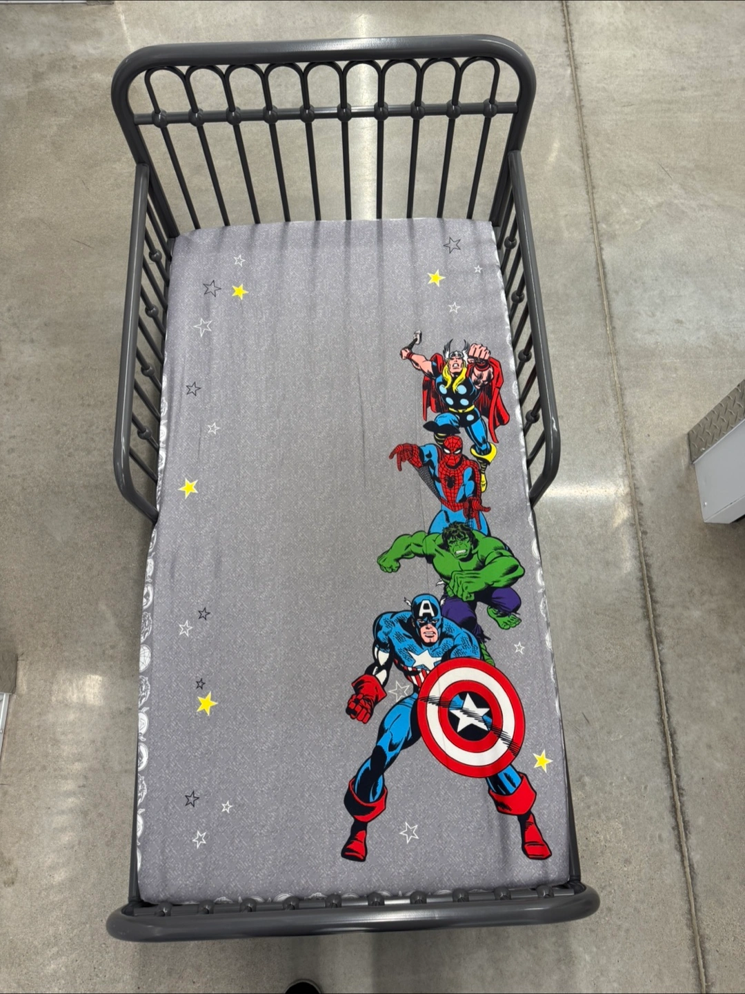 A bed with a metal frame. Features a Marvel themed bedspread. A cozy spot for your little one to relax after a long day.