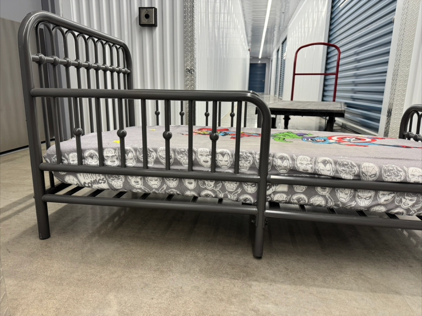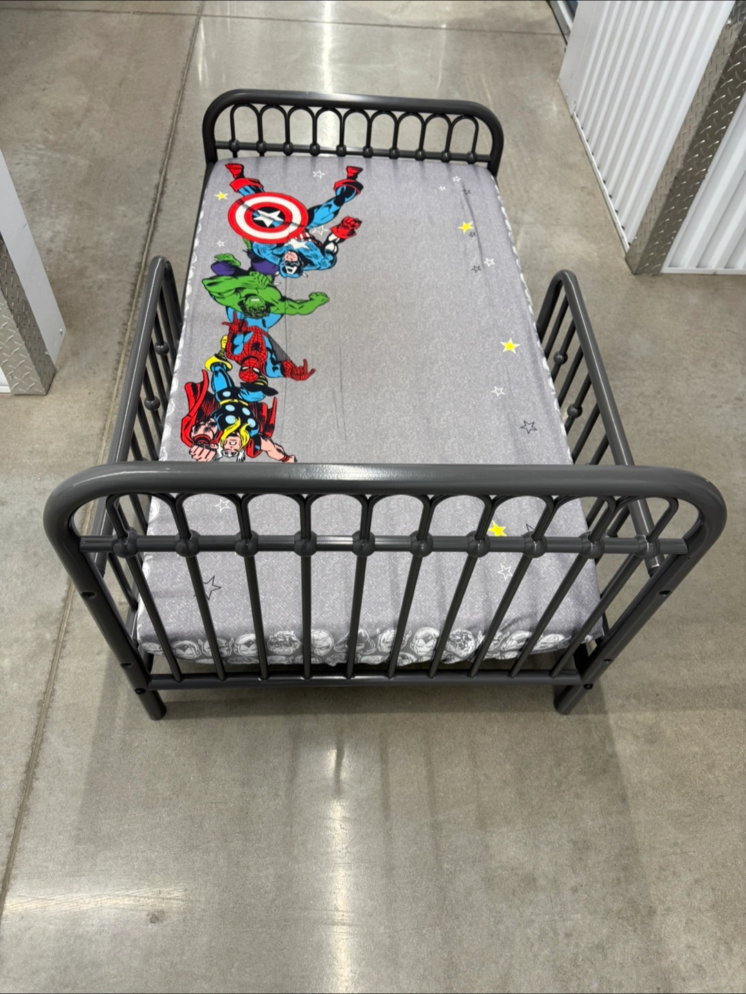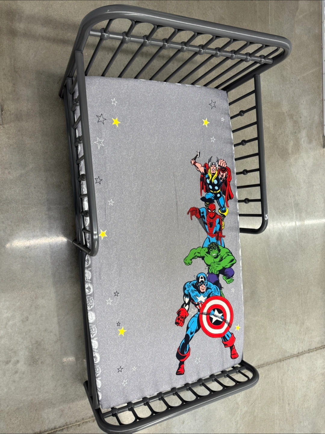 A bed with a metal frame. Features a Marvel themed bedspread. A cozy spot for your little one to relax after a long day.