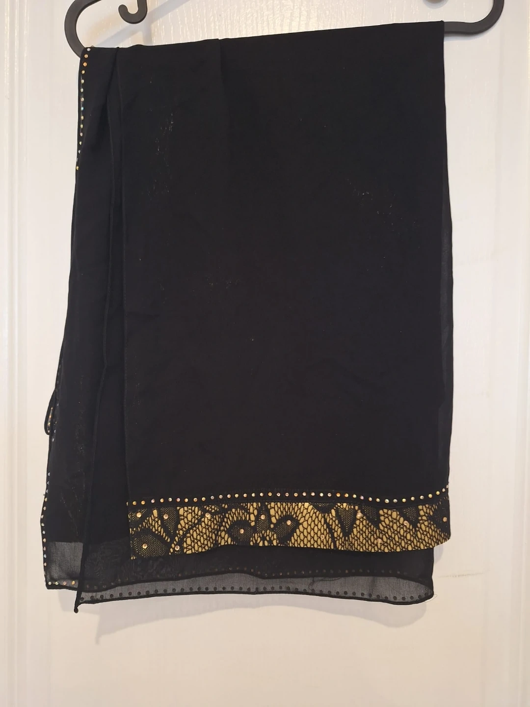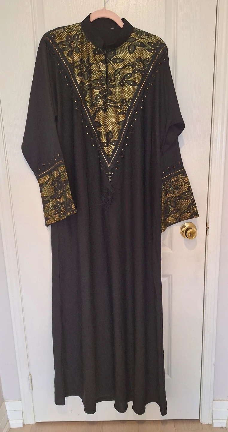 As new, beautiful Abaya purchased from Dubai a few years ago. Elaborate stone and lace work in front and sleeves. Comes with a hijab with similar embroidery work too.