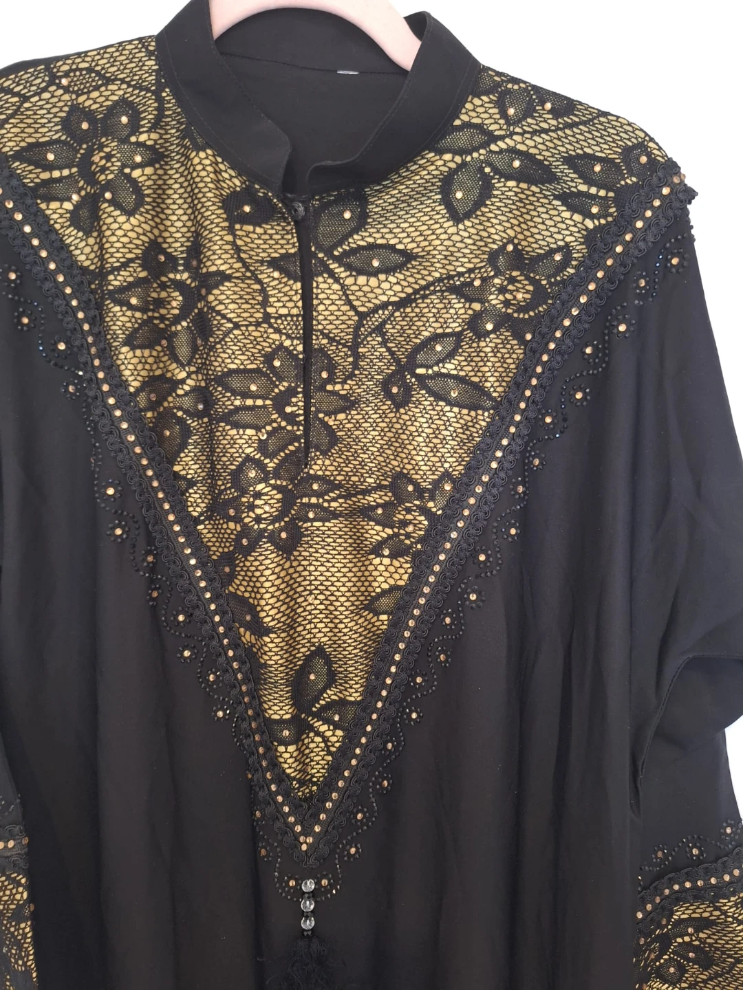 As new, beautiful Abaya purchased from Dubai a few years ago. Elaborate stone and lace work in front and sleeves. Comes with a hijab with similar embroidery work too.