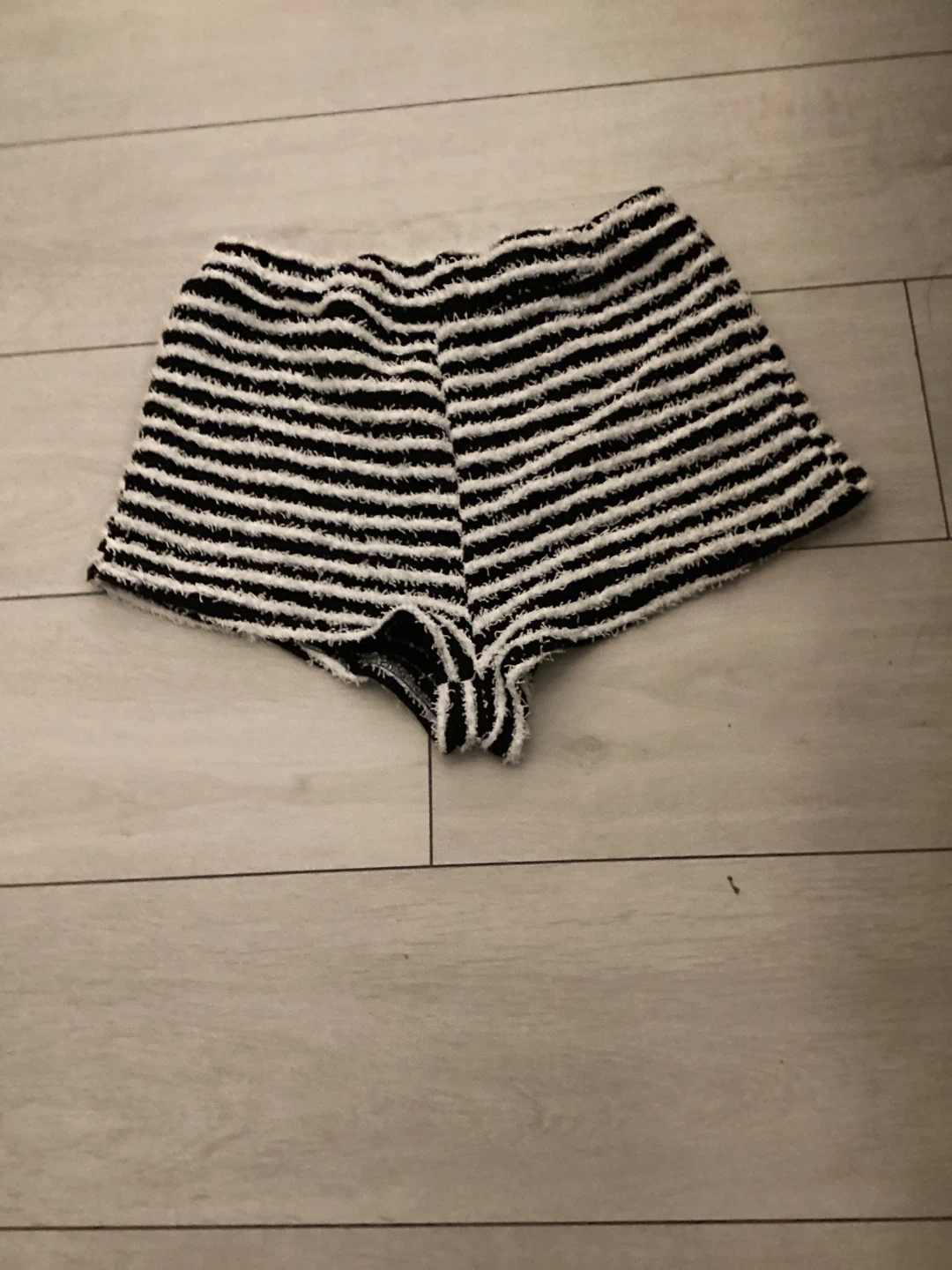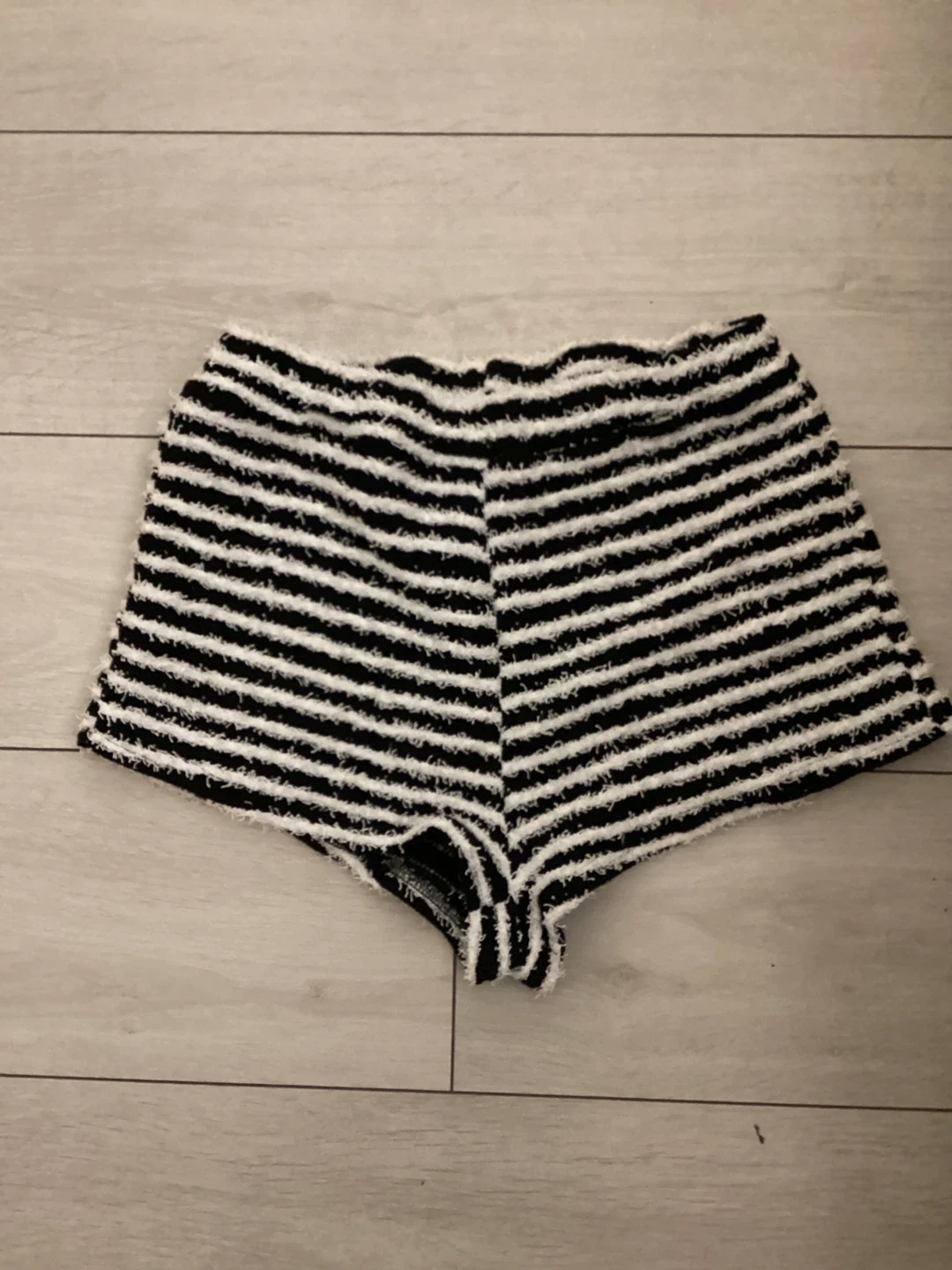 Comfy terry cloth shorts with a black and white stripe pattern. They have an elastic waistband for a good fit. Material is soft and fuzzy.
