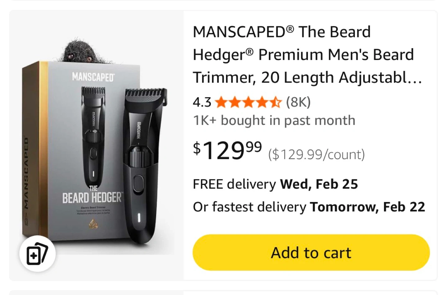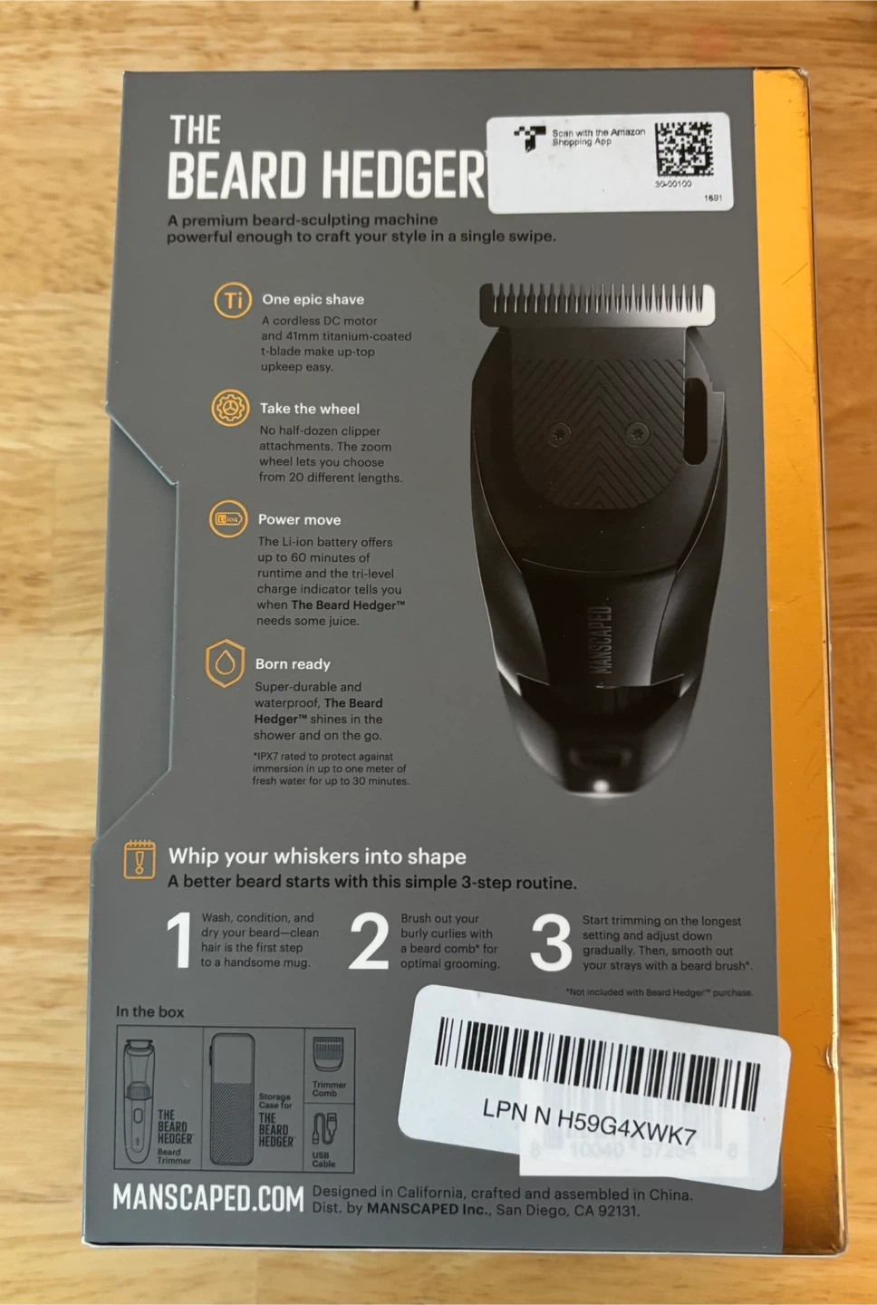 MANSCAPED The Beard Hedger electric beard trimmer. It features a premium ceramic 2.0 skin-safe blade and a rechargeable Li-ion battery. It's waterproof and includes a charging cable and travel case. Perfect for detailed beard grooming!