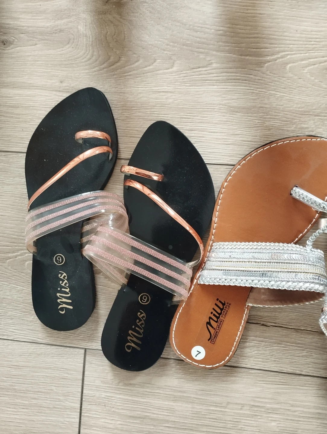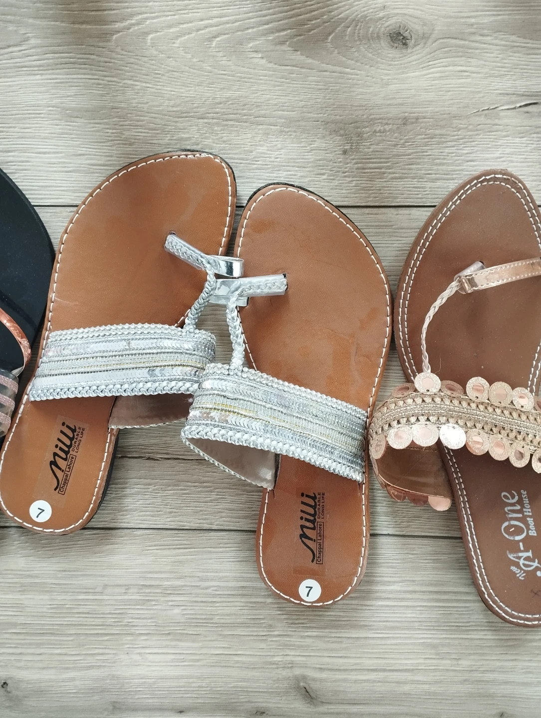 Includes three pairs of Miss sandals in black with rose gold accents, two pairs of Milli sandals in tan with silver embellishments, and two pairs of A-One sandals in brown with rose gold trim. Sizes are 7 and 9.